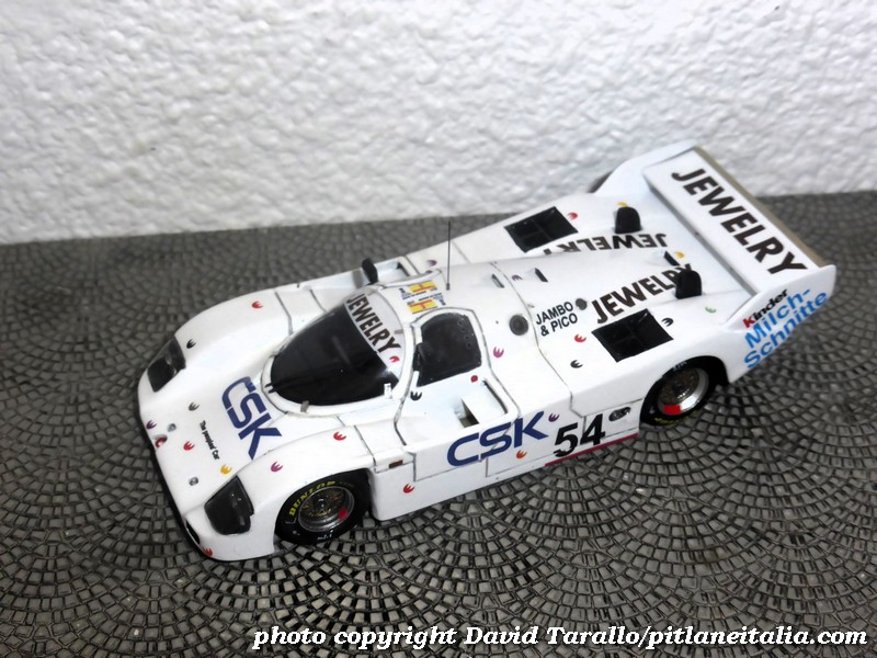 Il modello che vedete in queste foto è, appunto, uno dei famosi GPM Studio. Forse non il più bello. La base è quella, invero abbastanza discutibile, della svizzera GCAM. Però è una versione peregrina e anche in questo sta il suo fascino. Nel 1989 Vern Schuppan decise di ricostruire la propria 962C incidentata e fu il primo a dotarla di un telaio totalmente in carbonio, sviluppato con l’aiuto diretto della Porsche. Altri ci avevano provato, a rimpiazzare il telaio classico della 956/962C ma si trattava al massimo di pannellature e trasformazioni che non si sostituivano mai del tutto agli elementi metallici. Venne conservato il numero di serie originario (138), e la 962C con telaio in carbonio conobbe una carriera abbastanza densa, fra Europa e Giappone, presentandosi infine alle prove della 24 Ore di Le Mans 1991, iscritta in Gruppo C1/Categoria 2 dal britannico Tim Lee-Davey, che non ci fece neanche un giro. Non la pilotò neanche Val Musetti, che compare nell’elenco iscritti. Ci fecero invece le sessioni di qualifica il giapponese Katsunori Iketani e Mercedes Stermitz, ex Miss-Austria. Risultato: 4’18″611 e tutti a casa, anche se con un 4’15” la qualificazione sarebbe arrivata. La vettura esiste ancora oggi, in un’improbabile livrea Jägermeister.