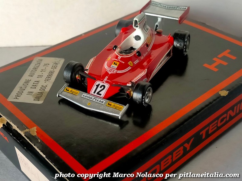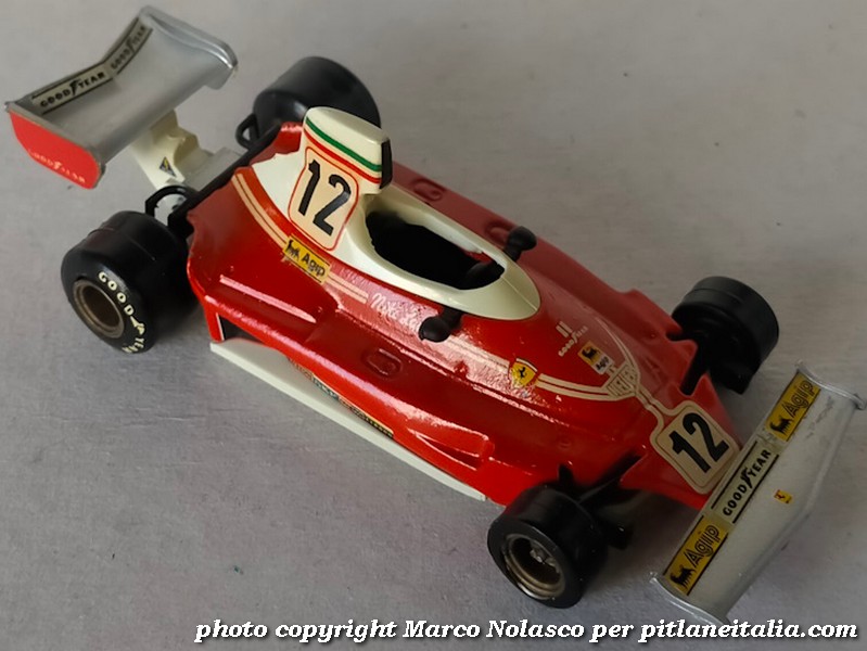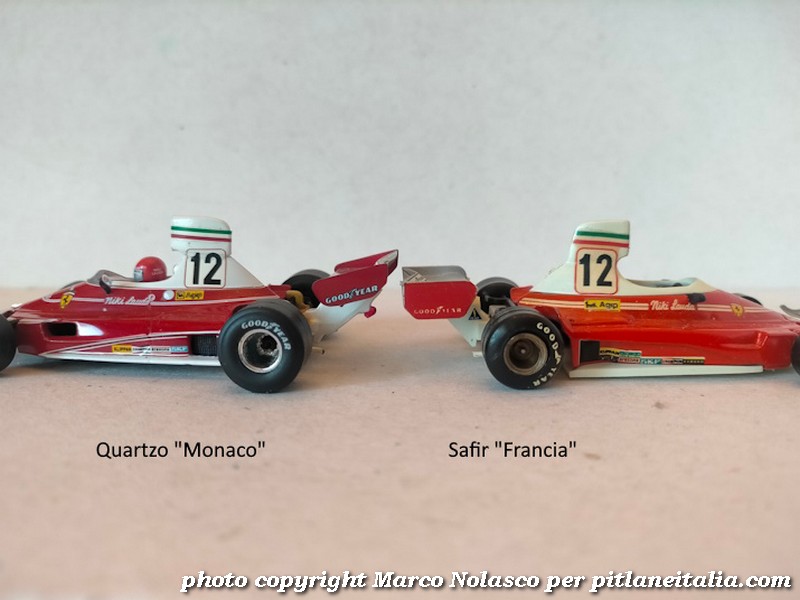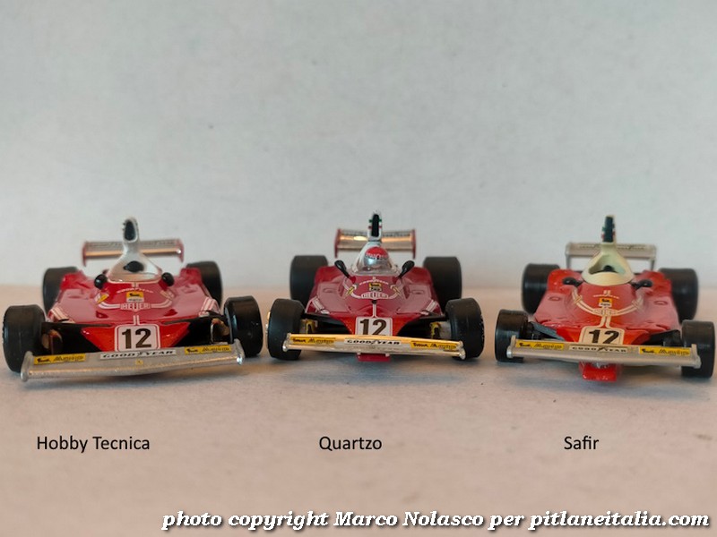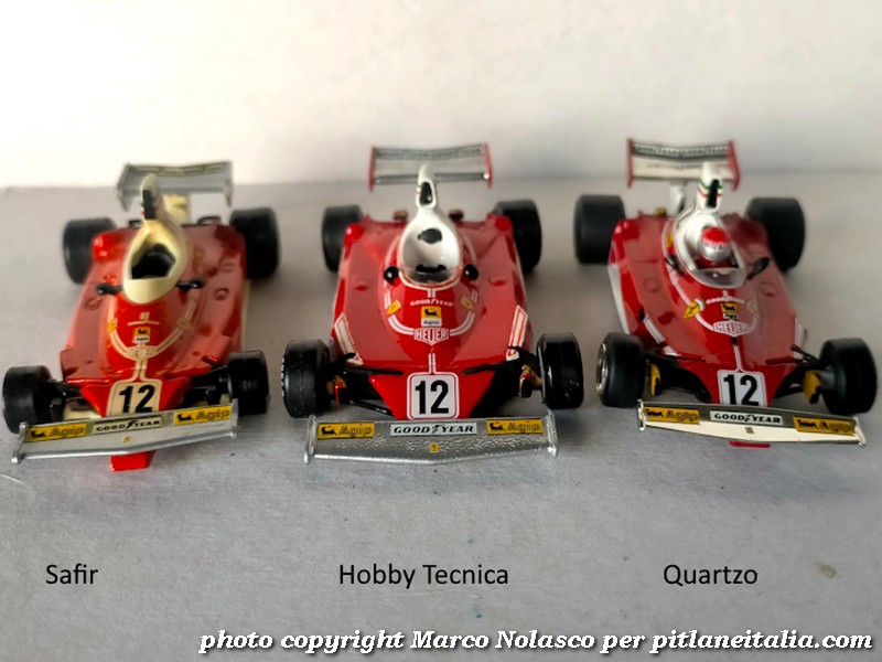 Come forse si legge nel foglietto, la versione riprodotta è quella che vinse il Gran Premio di Monaco del 1975, ovviamente con Niki Lauda, telaio 023. L’anno dopo, nel 1976, uscì il primo modellino industriale, un die cast della Safir Super Champion n.80. E’ ovviamente più semplice dell’Hobby Tecnica (costo 3000 lire contro 9800), ma la resa è molto buona, la scala è decisamente più vicina all’1/43 e la decorazione, anche se non completa, è di effetto. Troppo piccole le ruote anteriori. Presenta alcune differenze rispetto al kit toscano che potrebbero giustificare una classificazione del modello in un’altra versione. Infatti le paratie dell’alettone posteriore sono diverse rispetto all’Hobby Tecnica e mi sembrano molto simili a quelle che la vera sfoggiava al vittorioso Gran Premio di Francia sul circuito di Le Castellet, sempre nel 1975. Anche la striscia di decals sui fianchi è