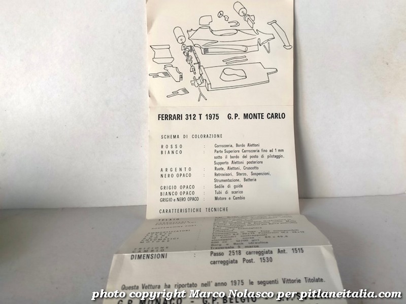 Riprendo il tema dei confronti tra modelli di formula 1 con tre modellini della Ferrari 312 T del 1975, tutti in versione Niki Lauda. Spero che possa interessare. Il più vecchio è un kit in metallo bianco, il n.5 della Hobby Tecnica che fu il più tempestivo, se ricordo bene, e uscì nel 1975. Era confezionato nella tipica ed elegante scatola piatta nera e rossa, con all’interno un pre-formato chiuso da un plexiglass sagomato e diviso in vari scomparti che dividevano le varie parti del kit. Un dettagliato foglio con istruzioni e storia della vettura vera arricchiva la confezione. Il contenitore interno è ricoperto da un “vellutino” simile agli interni di certi modelli Politoys M, Un foglietto con le famigerate decals a secco completava il tutto. Che dire del modello? Direi buono per quei tempi, a parer mio, ma penalizzato da dimensioni troppo generose, soprattutto la larghezza, ma non solo, come si vede nella tabella allegata. Di seguito alcune foto del mio montaggio dell’epoca.