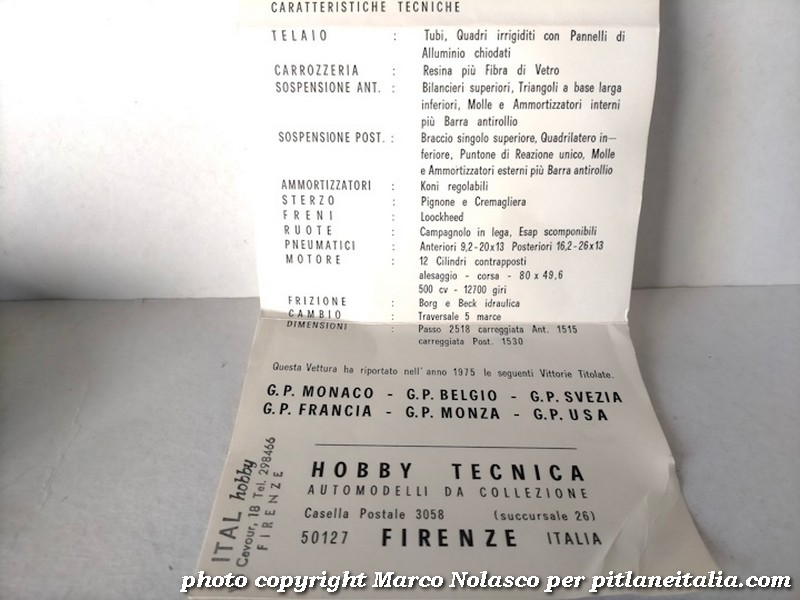 Scusate, ho dimenticato di evidenziare l’ etichetta bianca applicata in diagonale sulla scatola dell’ Hobby Tecnica, dove si legge che l’ autorizzazione della Ferrari a riprodurre la vettura è del 18 novembre 1975.