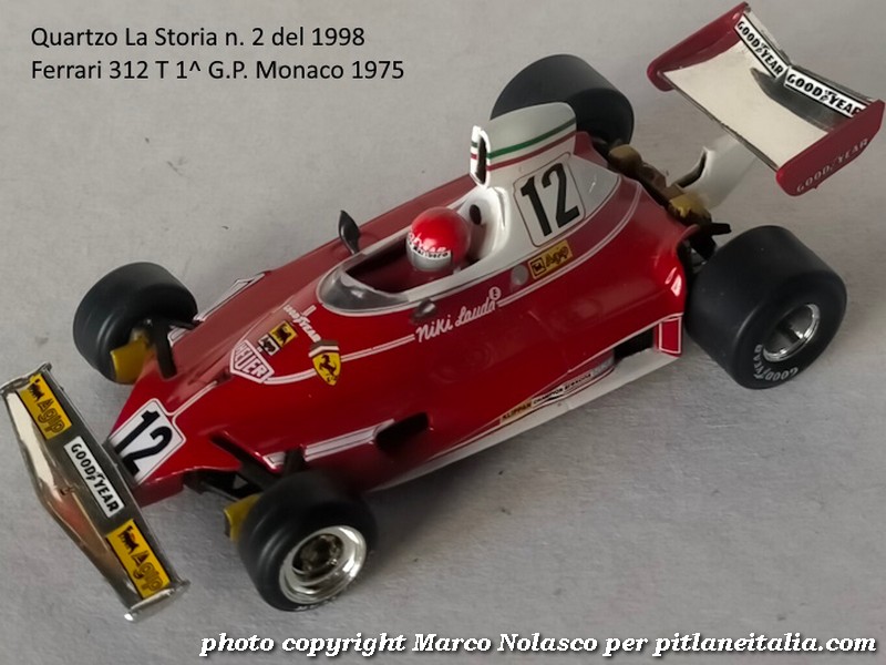 La terza e ultima interpretazione della 312T è un ben più moderno Quartzo, precisamente il n.2 della serie “La Storia” dedicata alle formula 1 del Cavallino. Uscì nel 1998. Qui siamo nel campo dei modelli industriali per collezionisti di livello medio alto, almeno per l’epoca. Anche questo riproduce la vettura vittoriosa a Montecarlo e, piaccia o meno, è dotato di pilotino. E’ quello dei tre che rende meglio le proporzioni della vera grazie soprattutto alle dimensioni del corpo vettura e a quelle delle ruote. Eccessiva la lunghezza, come del resto negli altri due, forse a causa di un eccessivo sbalzo dell’alettone posteriore. La tinta è un rosso intenso, più convincente di quello del Safir tendente all’arancio. La confezione è il solito ed elegante cofanetto nero di quella serie, che non ho a portata di mano. Dei tre il Safir è quello che presenta una migliore definizione dei particolari della