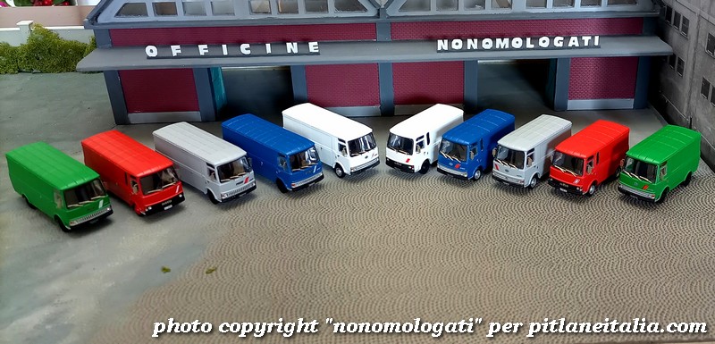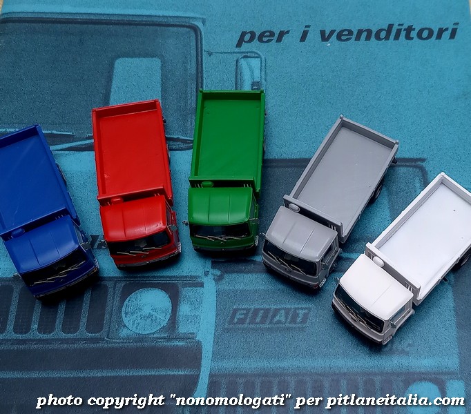 Di seguito, gamma Iveco furgonata: Passo lungo e corto nei cinque colori disponibili all’epoca (€ 75) e OM 50 tripla cabina (€ 75).