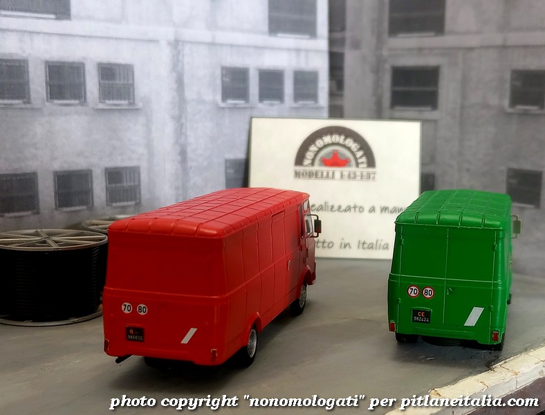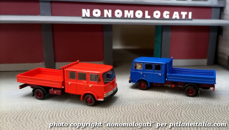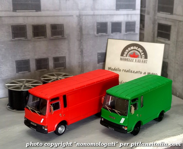 Versione del furgone 50 con loghi Iveco. Sono stati montati i tipici tergicristalli (due anziché tre) con le spazzole più lunghe. Il furgone rosso ha il passo lungo, il verde quello corto. Solo per notizia, il furgone gamma Z, proposto da Brekina, è stato realizzato solo con il passo medio. Prezzo al pubblico, € 75 l’uno.