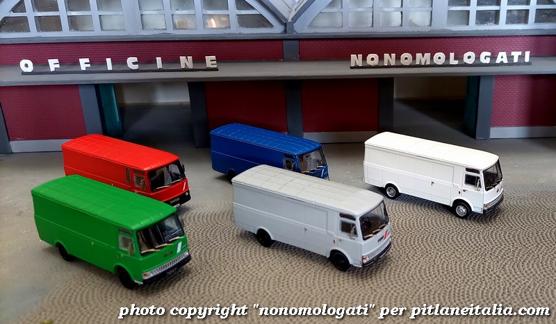 Di seguito, gamma Iveco furgonata: Passo lungo e corto nei cinque colori disponibili all’epoca (€ 75) e OM 50 tripla cabina (€ 75).