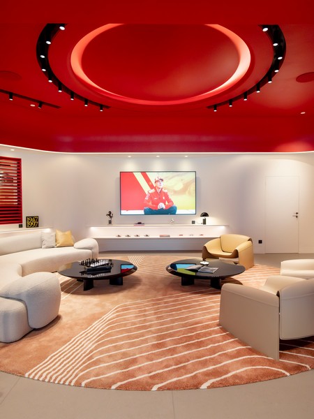 La centralità della persona è ulteriormente enfatizzata dalla “piazza”, luogo di incontro dello showroom, di forma circolare, che si ispira alle piazze dei borghi e delle città italiane. I visitatori diventano protagonisti di un’esperienza condivisa, favorendo la connessione e un profondo senso di appartenenza con il brand. La Piazza è un fulcro di interazione in cui i membri della famiglia Ferrari possono riunirsi, condividere emozioni e immergersi nel mondo del Cavallino Rampante.