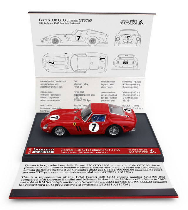 Nella serie delle Ferrari GTO, Brumm ha aggiunto la versione 4 litri di Le Mans 1962 (Bandini/Parkes), un modello non senza diverse “licenze poetiche”, vista la sua derivazione dal vecchio Box Model. Serie limitata a 200 pezzi numerati. Nell’occasione, sono state rimesse in catalogo la versione rossa neutra (modello del 2012, R508-1)e la numero 19 di Le Mans ’62 (Noblet/Guichet), uscita nel 2014, catalogo R534.