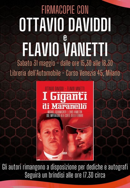 Si svolgerà il prossimo 31 maggio dalle ore 15.30 la sessione firmacopie del libro di Ottavio Daviddi e Flavio Vanetti, I giganti di Maranello. L’evento avrà luogo presso la Libreria dell’Automobile in Corso Venezia 45 a Milano. Seguirà brindisi alle ore 17.30.