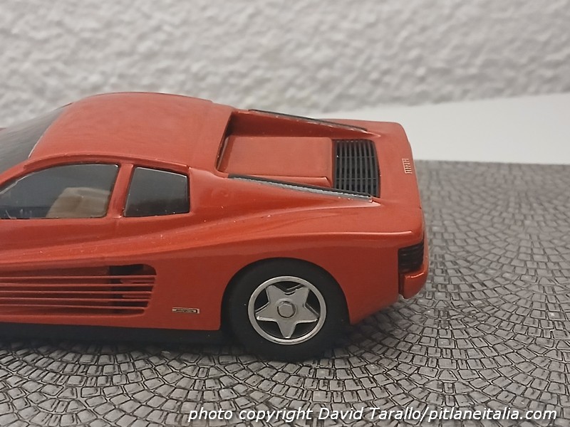 Arrivò quasi in contemporanea il kit Starter, ovviamente anch’esso in resina. Non si fece attendere troppo neanche Riva, col modello Meri Kits in metallo bianco. Quanto al settore diecast, in quel periodo abbastanza “morto”, fu Burago a proporre, nel 1985, una riproduzione economica della Testarossa, nel classico rosso e anche in nero. Subirono il fascino della Testarossa anche marchi meno noti, dalla portoghese F.Project, con un kit abbastanza mediocre uscito a metà ’85, alla francese Amis du 1/43 (Yolande Lamy) nell’estate del 1989, già con la configurazione doppio specchio. Nel 1990 sarebbe arrivata anche BBR con la “monospecchio” d’origine, disponibile in rosso, nero, giallo e rosso scuro metallizzato. Nello stesso anno uscì l’AMR, in svariati colori, disponibile solo factory built ad un prezzo adeguato. L’AMR faceva davvero status symbol e la domanda era sempre maggiore dell’offerta. Quello era il vero lusso, altro che i resincast premium di oggi. In anni successivi si videro ulteriori interpretazioni della Testarossa, fra cui l’Herpa, tutto apribile e in materiale plastico (1992), discusso ma senza dubbio innovativo.