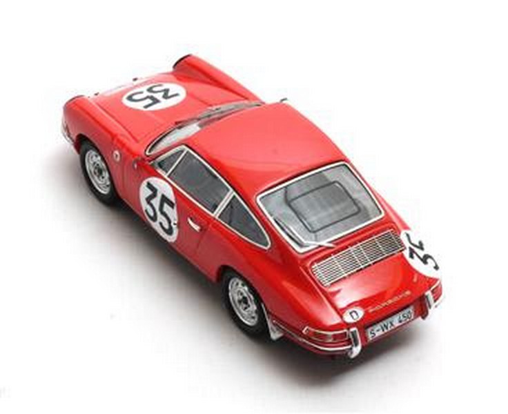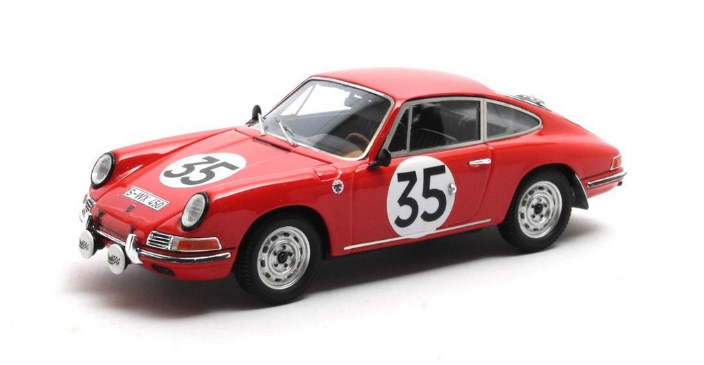 Si tratta della 911S arancione a motore 2 litri, passata alla storia come la prima 911 ad aver preso il via della 24 Ore di Le Mans. Il modello non è inedito (ricordiamo il vecchio Vitesse ma anche il più recente Spark) e pare accurato anche a livello di dettagli. Forse ancora più interessante perché del tutto inedita, la versione delle prove di Le Mans 1966 (2-3 aprile), pilotata dallo stesso Kerguen, da Herbert Linge e da Huschke von Hanstein. La vettura ottenne il 21° tempo assoluto, girando in 4’45″8 con Linge.