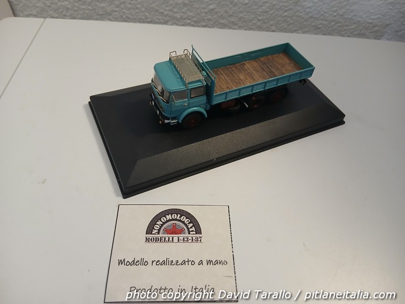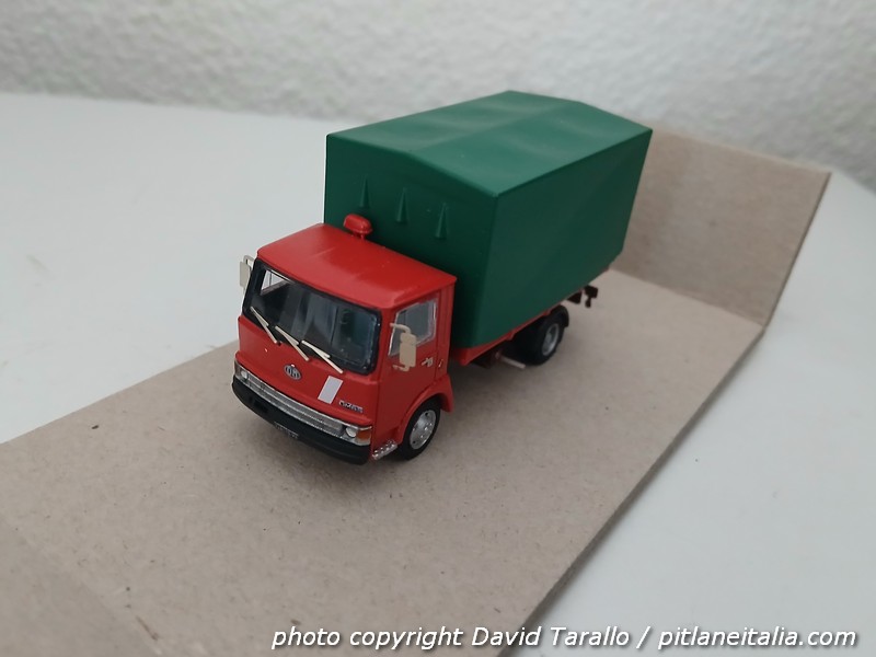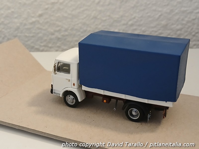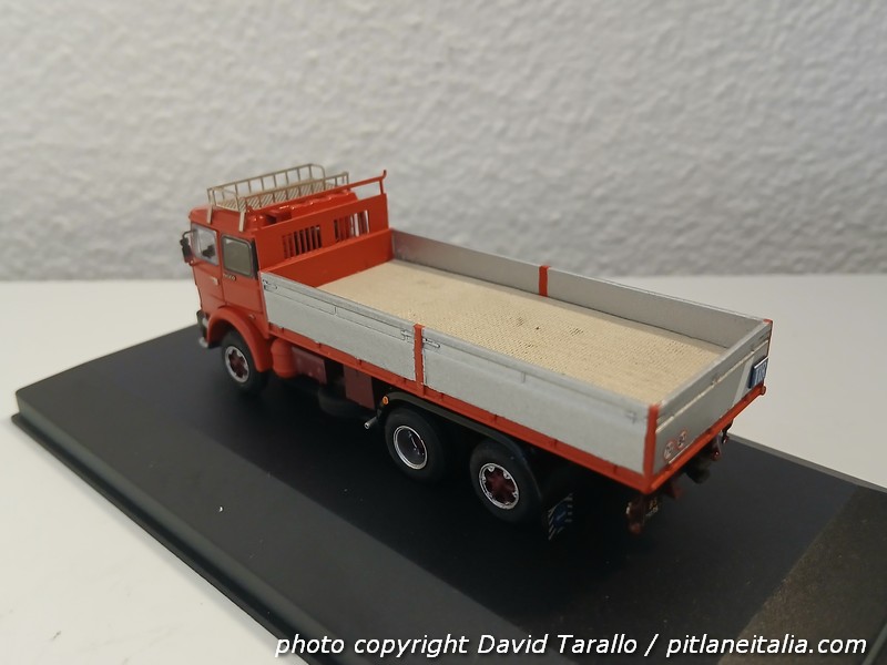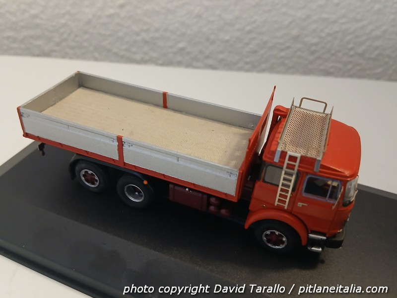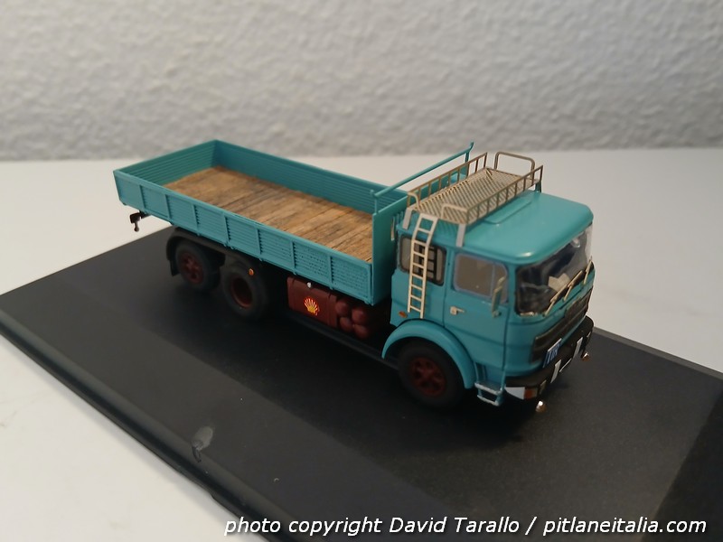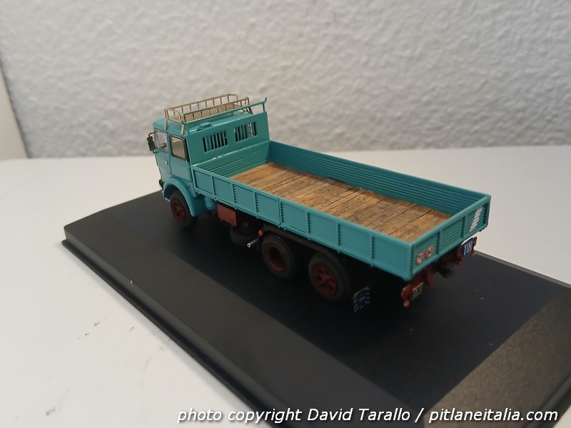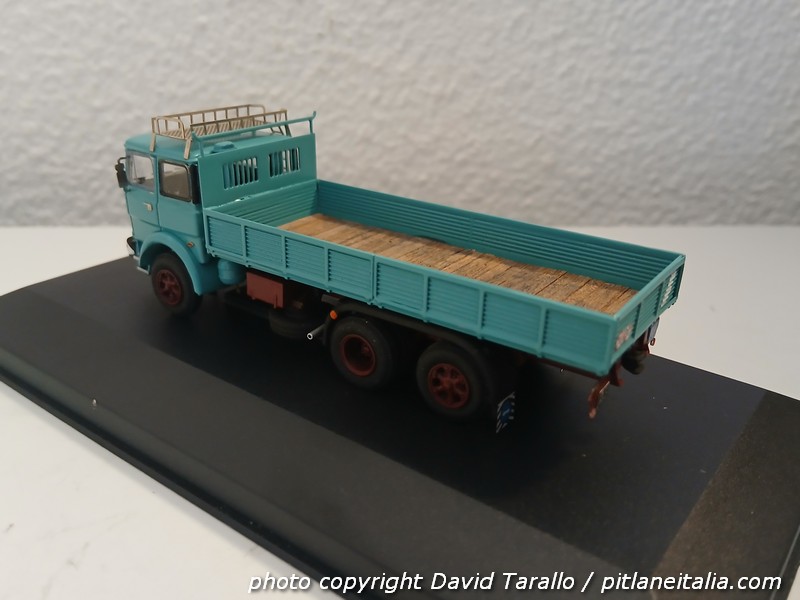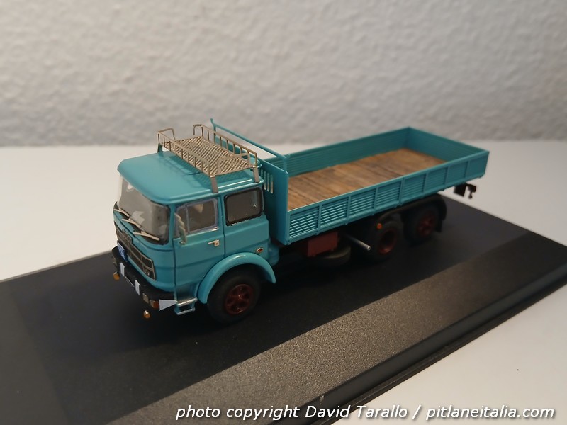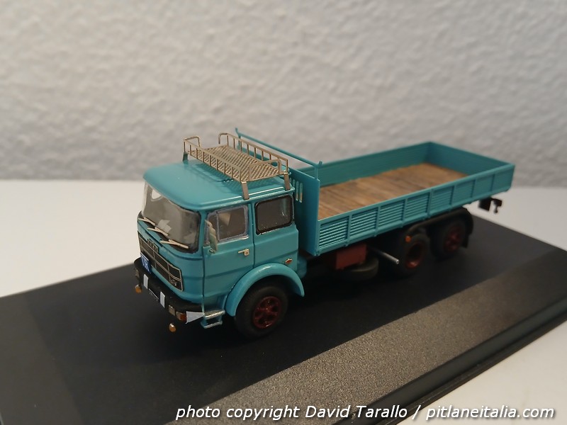 Per quanto riguarda i mezzi più grossi, è uscito un Fiat 619 a tre assi nel caratteristico “azzurro farfalla” che molti ricorderanno anche sulle vetture stradali, come la 500R, la 126 o la 127. L’azzurro è stato realizzato da una carrozzeria Iveco, così come il rosso del telaio. Il 619 di nonomologati si caratterizza per la presenza del bagagliaio fotoinciso sul tetto e per il piano di carico rivestito con effetto legno. Particolare cura è stata dedicata al montaggio dei vetri, posizionati uno ad uno con l’aiuto del crystal-clear.