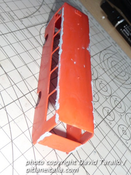 Le fasi di preparazione e di verniciatura (con fondo e bomboletta Tamiya) furono tutto sommato divertenti anche se non prive di momenti “pericolosi” in cui rischiai di dover gettare tutto nella pattumiera. Da tutte queste manipolazioni, complice anche una buona dose di fortuna, ne uscì una carrozzeria tutto sommato dritta, simmetrica e senza troppi scompensi.