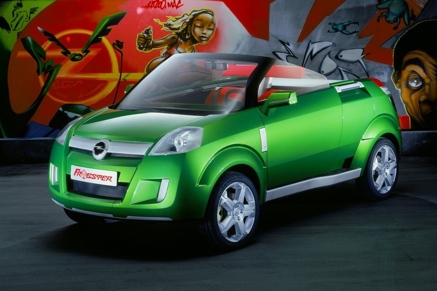 Allo IAA del 2001, Opel presentò una visione per lo sviluppo della mobilità del futuro. Con la Frogster verde brillante, i designer mettevano in discussione il concetto di piccola auto familiare. La Frogster scoperta, lunga appena 3,70 metri, poteva essere configurata sia come roadster a uno o due posti, decappottabile a tre o quattro posti o come pick-up. Ciò era reso possibile da una tenda a rullo elettrica in alluminio, che fungeva da tetto flessibile e poteva essere spostata su binari dalla parte posteriore al parabrezza all’altezza della linea di cintura. Anche il cosiddetto PDA (Personal Digital Assistant) era moderno: il minicomputer, che poteva essere collegato centralmente al cruscotto, poteva essere utilizzato come radiocomando o per sbloccare le portiere.
