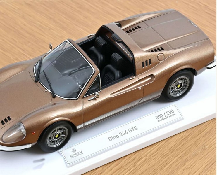 Norev ha appena commercializzato un’edizione excluweb della Dino 246 GTS in 1:18. Il modello, in nocciola metallizzato, è venduto in serie numerata e limitata a 200 esemplari (catalogo 187815). Prezzo € 75,00.