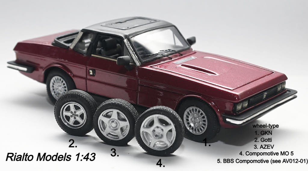 Sotto, la referenza AV013, Bristol 412 S2.5 del 1980 aggiornamento della Beaufighter, con lo stesso frontale a quattro fari. Sono ben sei i modelli di cerchio che possono essere richiesti per questo modello, anche se Rialto raccomanda in questo caso i GKN.