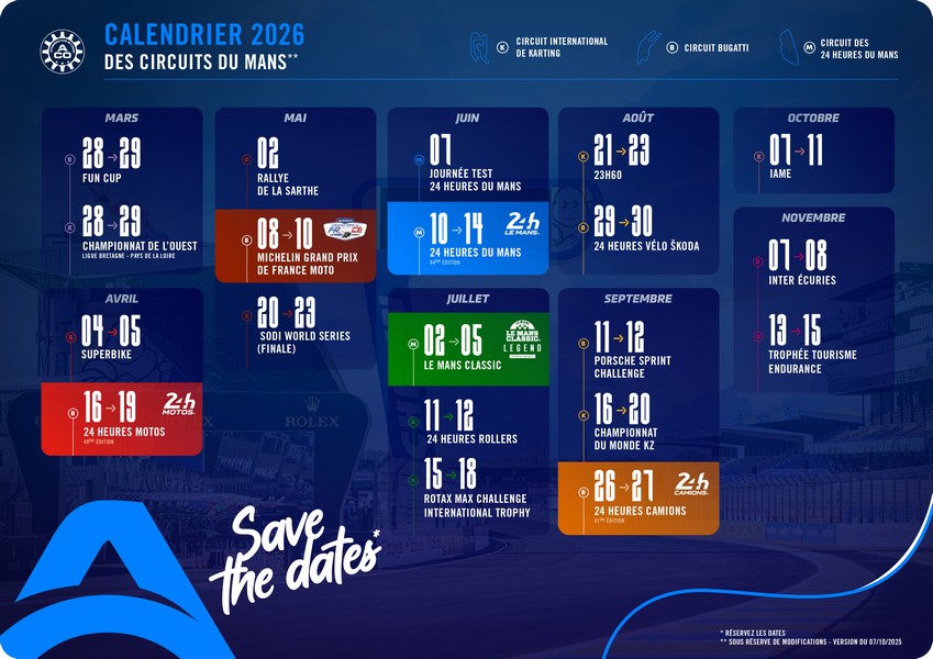 Sono state definite le date del calendario 2026 dei circuiti di Le Mans. La 94ma edizione della 24 Ore si svolgerà nella settimana del 10-14 giugno, con la giornata test programmata per il 7 giugno. La Le Mans Classic Legend, che dal 2025 ha preso cadenza annuale, si svolgerà dal 2 al 5 luglio.
