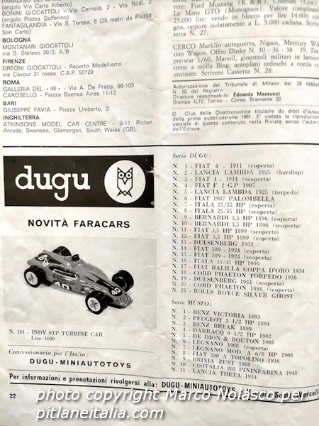 Il trafiletto su citato rimandava alla rubrica “Qui Parigi”, dove Roland Gerin trattava molto esaurientemente questa novità e annunciava altre monoposto Indy e, forse, anche europee. All’epoca le monoposto, formula 1 o Indy che fossero, erano mosche bianche nell’1/43 e l’iniziativa della Faracars fece sensazione anche per l’elevata qualità del modellino, superiore, a parer mio, agli analoghi modelli anche di ditte primarie come Dinky France e Solido. Basti osservare i molti dettagli applicati in metallo, probabilmente ottone. Solo Kanda faceva di meglio, ma a costi esorbitanti. Questo modellino costava invece 1600 lire, non pochissime, ma adeguate alla sua classe.