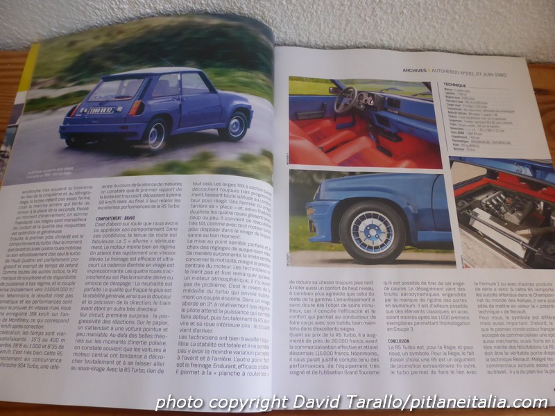 Mancavano pubblicazioni di questo tipo, ossia da edicola, consacrate alla sola R5 Turbo e questo fascicolo (diffuso in Francia a € 11,90) potrà accontentare una larga fascia di pubblico più o meno specializzato.