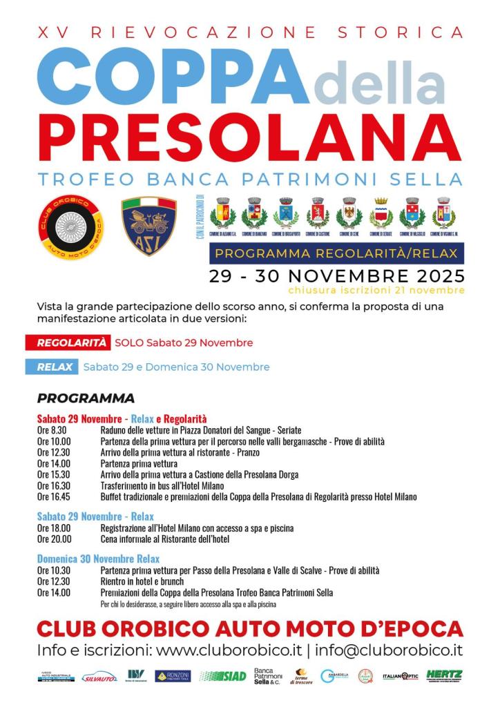 Sta per entrare nel vivo il weekend della 15ma Rievocazione Storica della Coppa della Presolana – Trofeo Banca Patrimoni Sella, in programma sabato 29 e domenica 30 novembre.