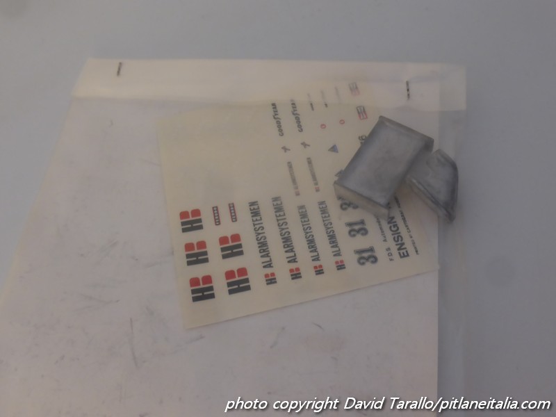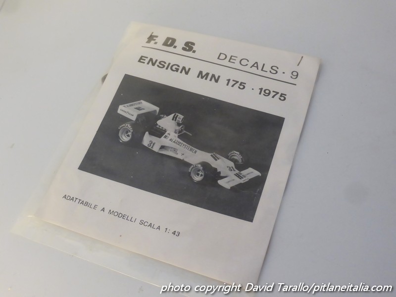 Curiosa la bustina numero 9, dove insieme alle decals per l’Ensign-Cosworth MN175 nei colori HB Alarmsystem del 1975 si fornivano anche l’alettone posteriore e lo snorkel in metallo bianco. Come base potevano essere utilizzati i kit FDS 63 e 63A, che riproducevano le Ensign del 1977 o, volendo, anche il kit John Day 248 della vettura del ’76.