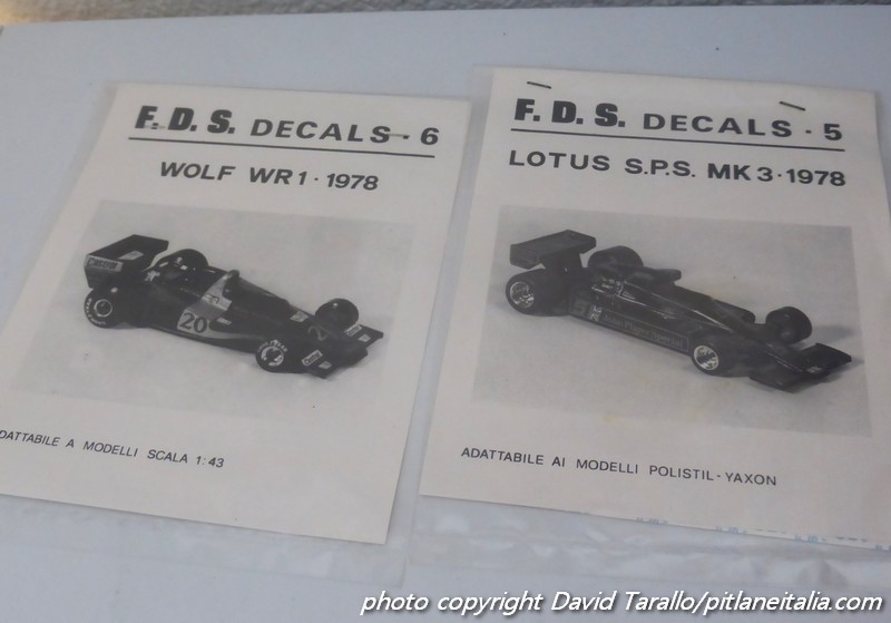 L’uscita delle Formula 1 in diecast della Yaxon – ma anche la disponibilità dei Polistil in scala leggermente più grande – suggerì a De Stasio di utilizzare alcuni fogli (Wolf WR1, Lotus JPS MkIII) per migliorare le basi industriali, sulle quali di solito non si andava tanto per il sottile quanto a esattezza e completezza delle decorazioni.