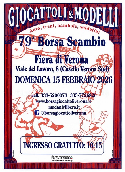 Domenica 15 febbraio a Verona presso la Fiera, Viale del Lavoro 8 (uscita A4 Verona sud), si terrà la 79a Borsa scambio giocattoli d’epoca, modellini, trenini, bambole, ufo robot, soldatini.