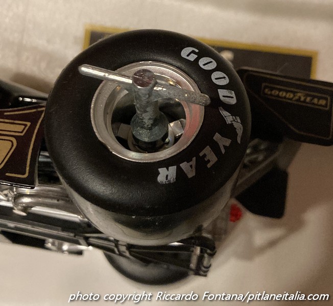 Tornando alla Lotus, è interessante notare come questo modello abbia costituito una sorta di ritorno alle origini per la Polistil, che dopo i fasti della 312 B3 e della McLaren M23 – che personalmente continuo a ritenere due dei massimi picchi in tema di diecast in assoluto, assieme all’Abarth 2000 in scala 1:25 – si era un po’ persa con la serie delle varie 312 T2, Brabham BT44 e Tyrrell P34 che, francamente, ricordavano più le Polistil piccoline in scala 1:55 esposte ai raggi gamma che le più altolocate sorelle di cui sopra, mentre la 78 è davvero buona: non ha le sospensioni funzionanti o la complessità della B3 o della M23, ma risulta estremamente fine e fedele, con un ottimo DFV ed un bellissimo retrotreno – qui assai visibile contrariamente a quanto si sarebbe visto nella Lotus 79 – e una linea resa benissimo, completata da decals adesive ma di buonissima grafica e fattura, soprattutto per il periodo.