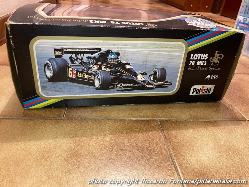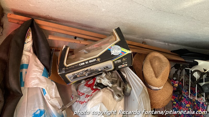 Parimenti, sempre nell’ottica di dare un senso a quanto c’è già, sto riordinando garages e cantine, e facendo una colossale opera di rimessa in servizio delle moto, di ordine dei ricambi, di messa in vendita dei ricambi di ciò che non ho e di smaltimento della spazzatura, cosa che mi prenderà almeno un anno a patto di farlo correndo, ed è stato proprio così, pulendo un box, che sabato scorso mi sono trovato faccia a faccia con la scatola originale della Lotus 78 della Polistil, appollaiata non ho neanche capito come accanto ad un parafango di una Suzuki da cross, ad altezza (della mia) testa: impolverata, col rhodoid sempre sfondato, ma non marcia né muffa.