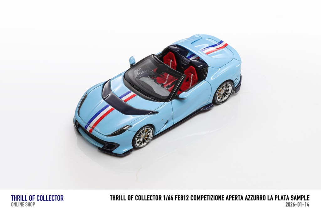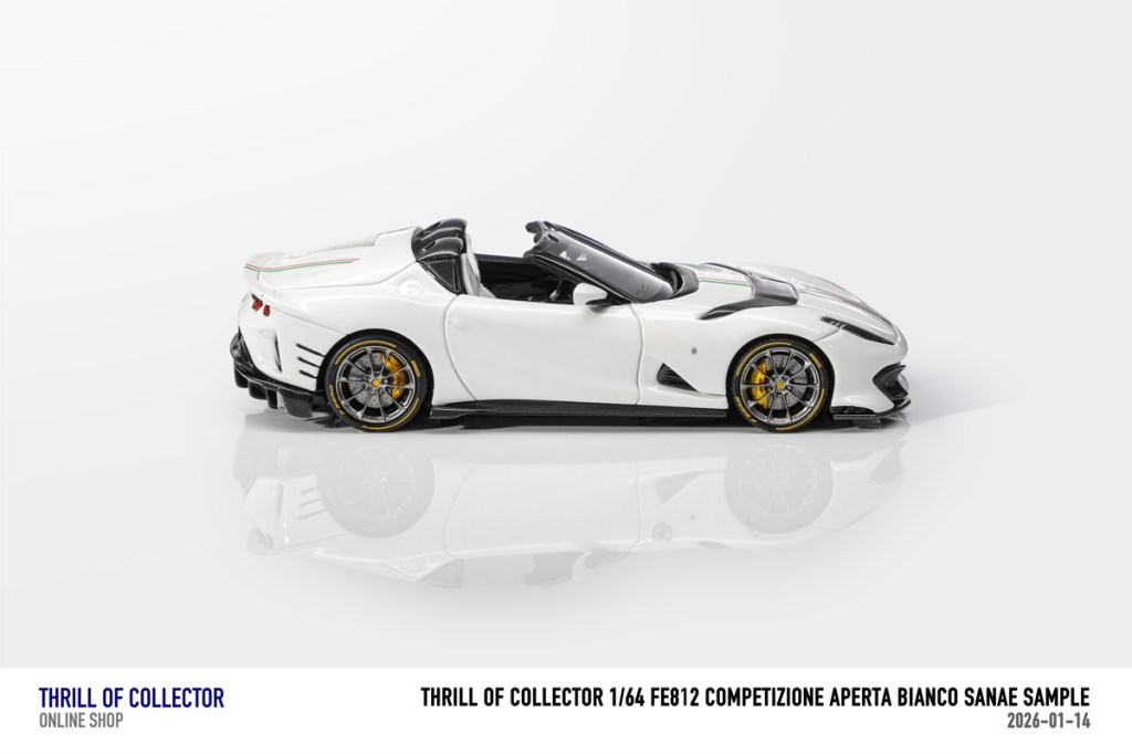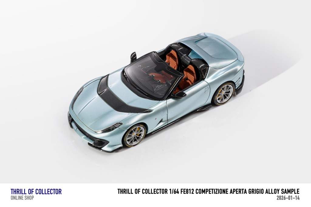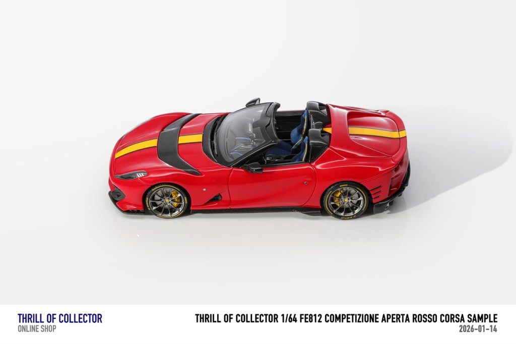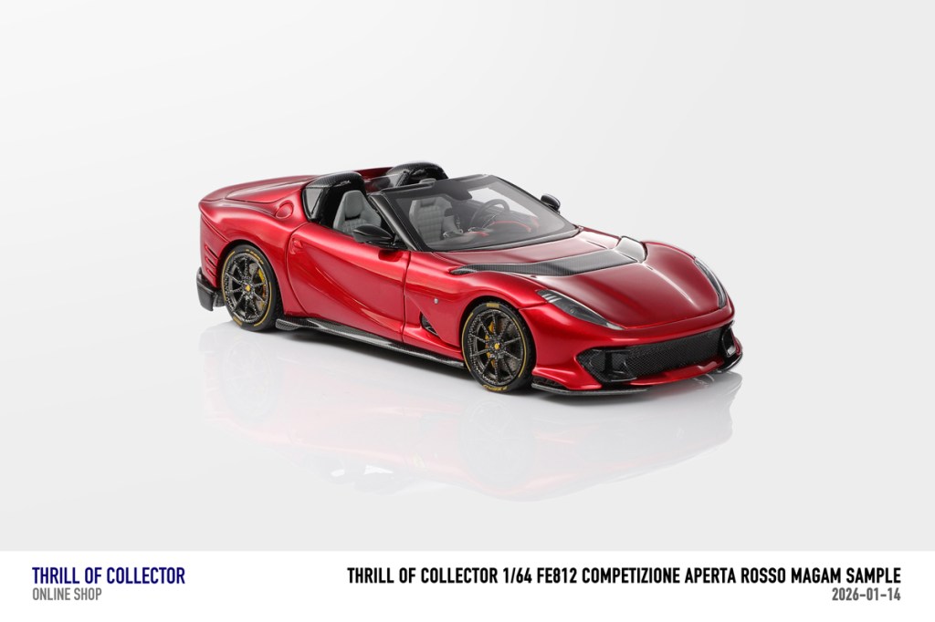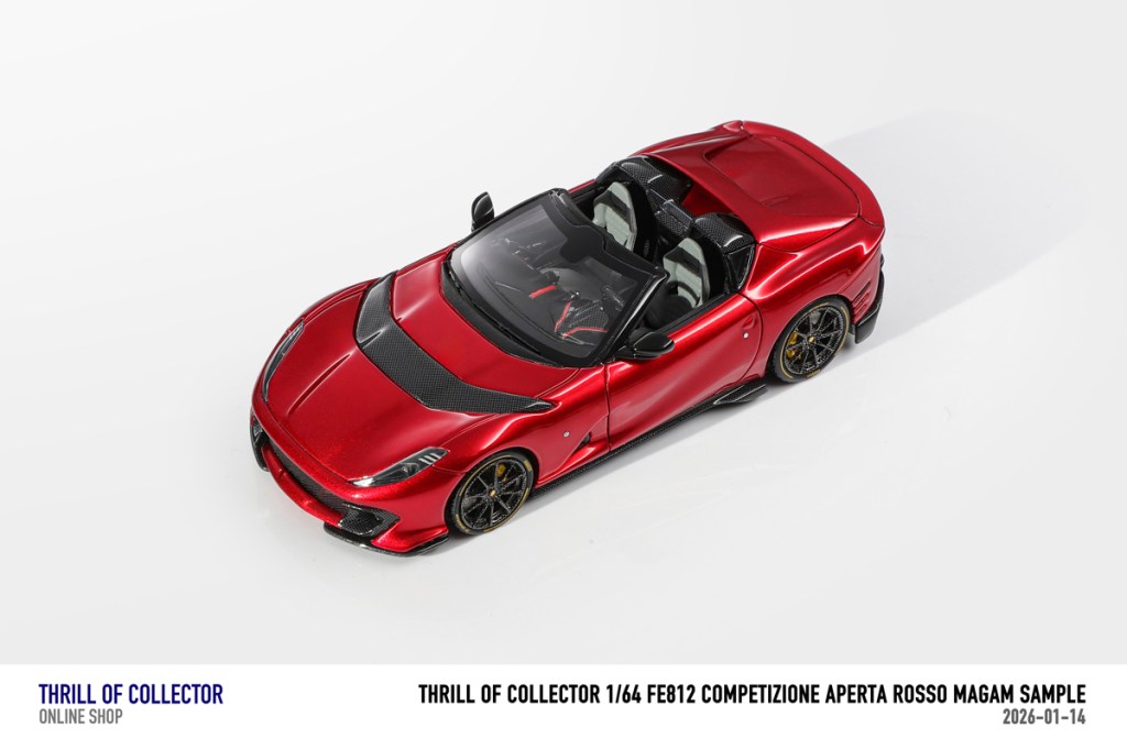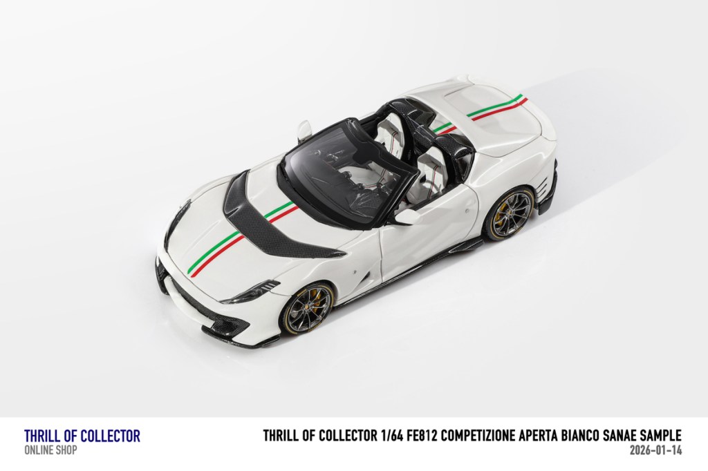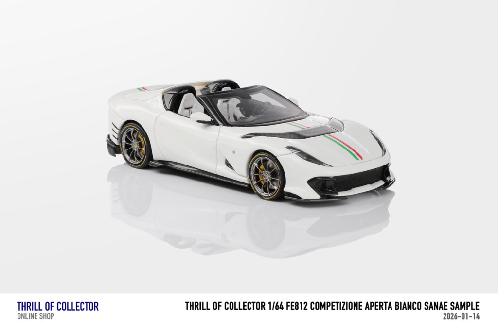 Thrill of Collector è un marchio cinese di resincast in scala 1:64 che fa capo alla nota Fuelme. E’ stata annunciata una serie di Ferrari 812 Competizione Aperta in vari colori e configurazioni, ognuna delle quali in edizione limitata a 199 pezzi. Il prezzo al pubblico consigliato è di USD 66.00, con un margine assai limitato rispetto al prezzo ai dettaglianti, che è di 50 dollari. Misteri della Cina. In ogni caso, questa è la lista completa delle versioni, che include tre “Shenzhen special editions”, vendute in un unico set a 175 USD.