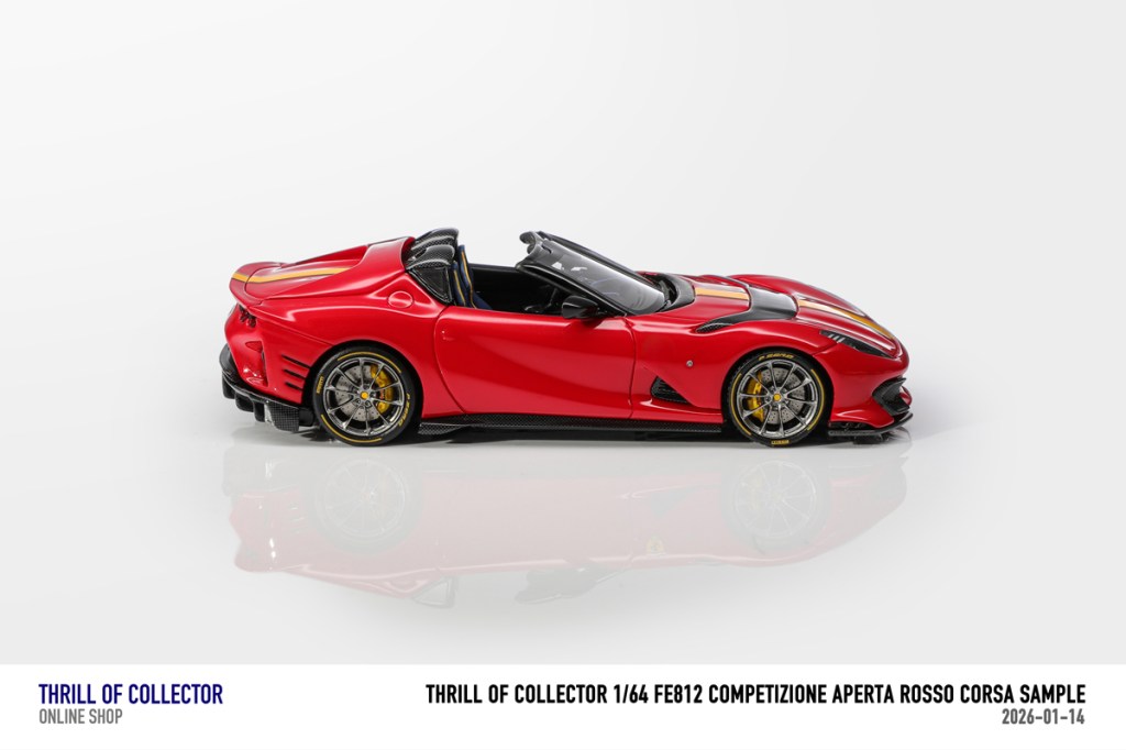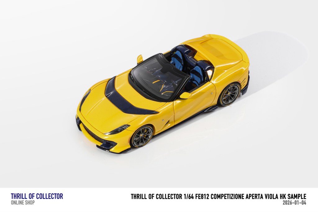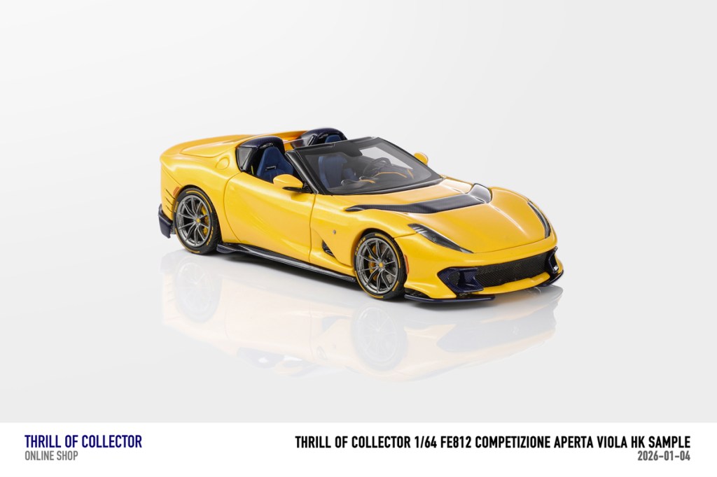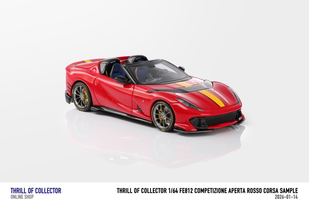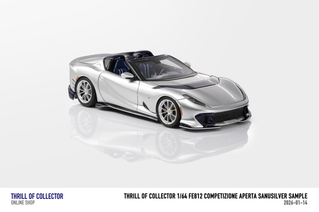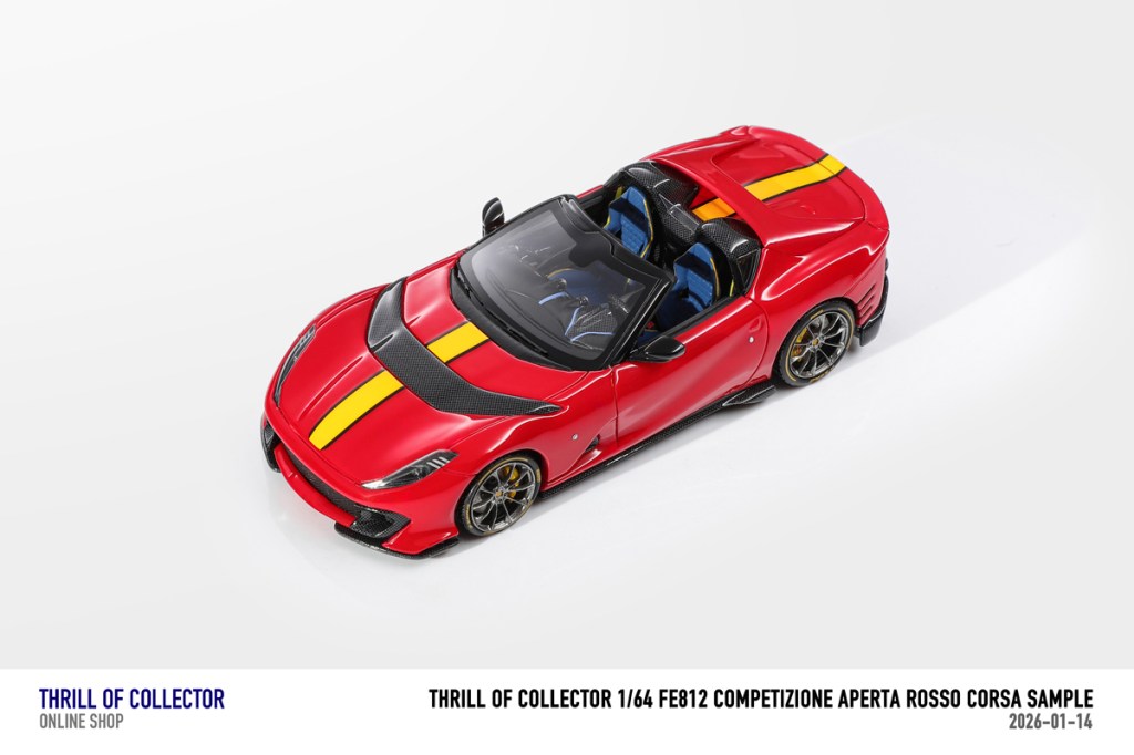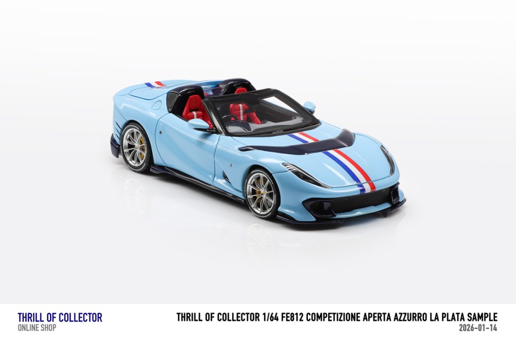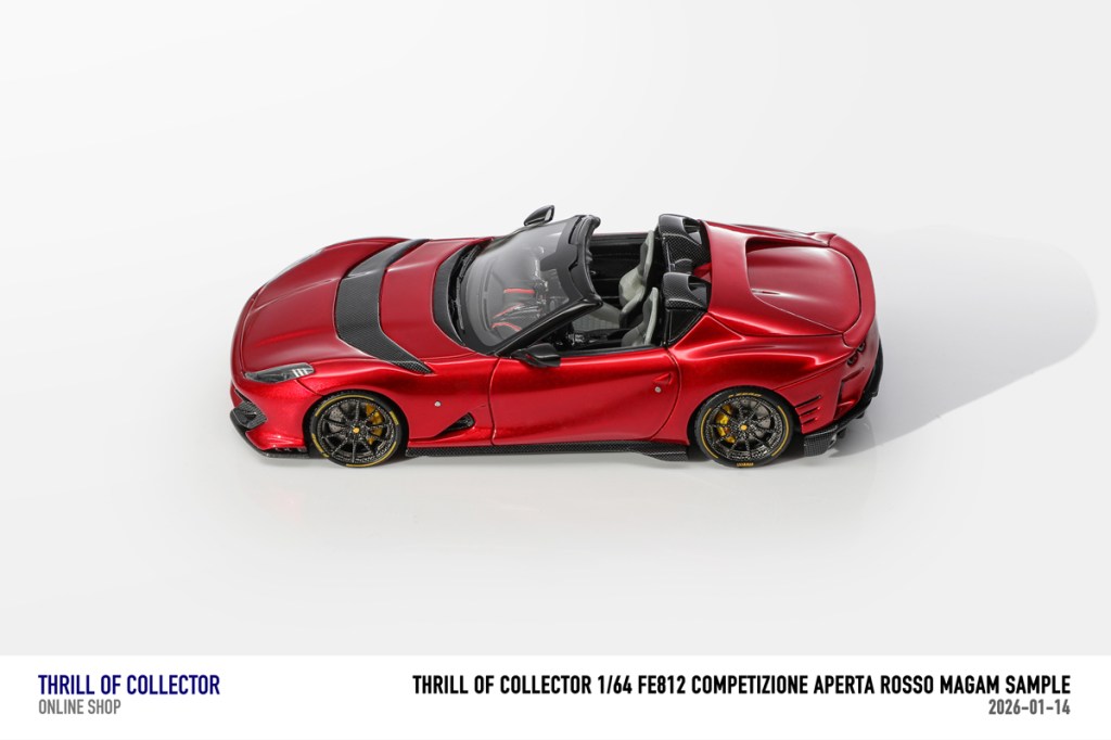 Thrill of Collector è un marchio cinese di resincast in scala 1:64 che fa capo alla nota Fuelme. E’ stata annunciata una serie di Ferrari 812 Competizione Aperta in vari colori e configurazioni, ognuna delle quali in edizione limitata a 199 pezzi. Il prezzo al pubblico consigliato è di USD 66.00, con un margine assai limitato rispetto al prezzo ai dettaglianti, che è di 50 dollari. Misteri della Cina. In ogni caso, questa è la lista completa delle versioni, che include tre “Shenzhen special editions”, vendute in un unico set a 175 USD.