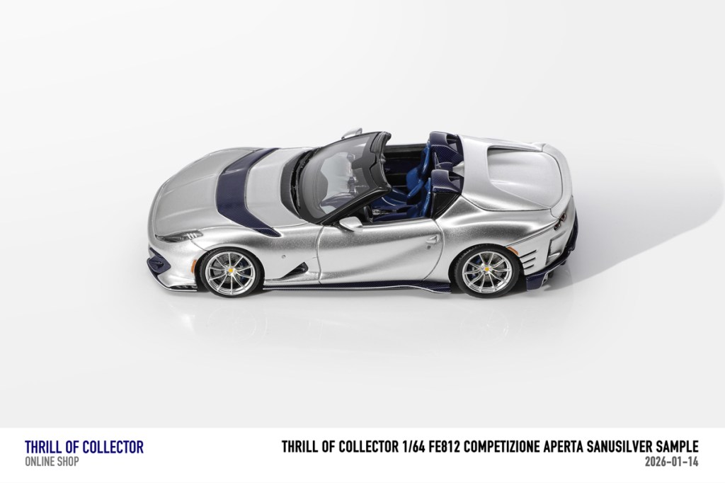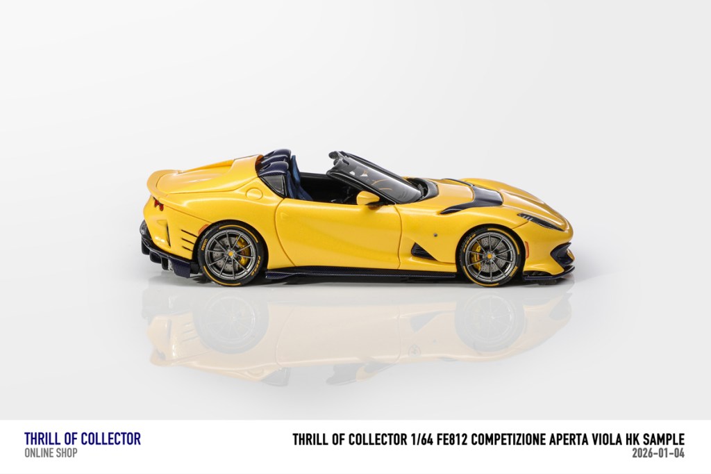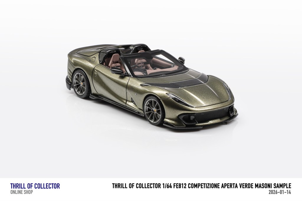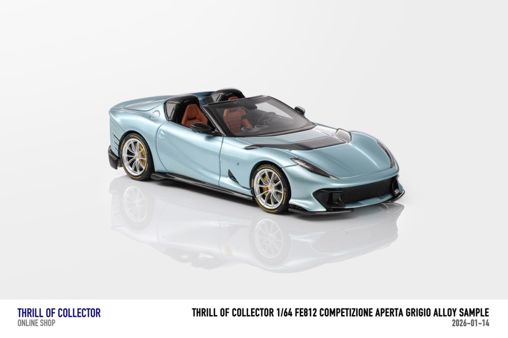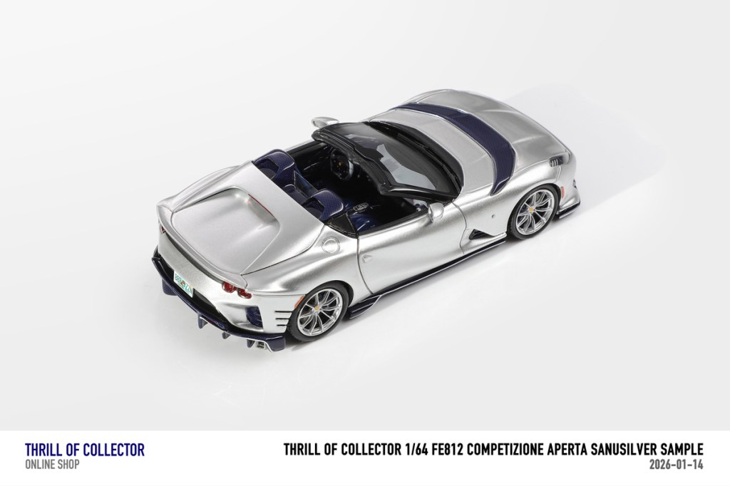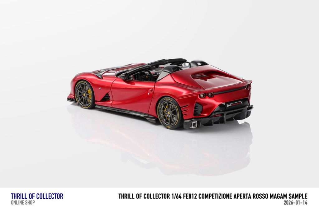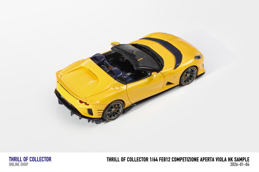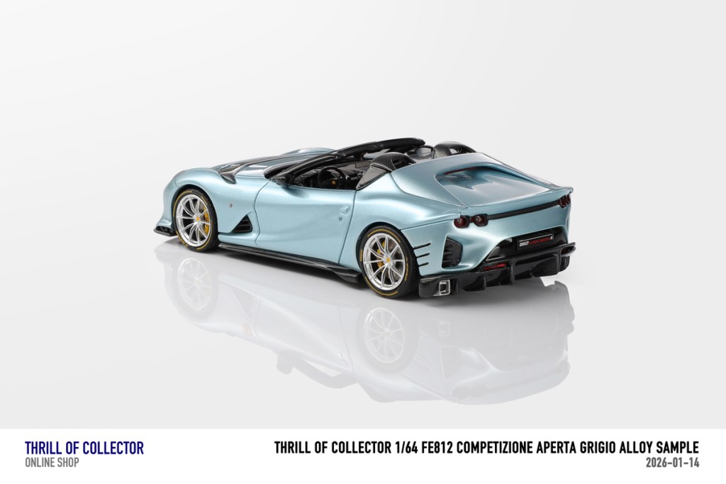 Thrill of Collector è un marchio cinese di resincast in scala 1:64 che fa capo alla nota Fuelme. E’ stata annunciata una serie di Ferrari 812 Competizione Aperta in vari colori e configurazioni, ognuna delle quali in edizione limitata a 199 pezzi. Il prezzo al pubblico consigliato è di USD 66.00, con un margine assai limitato rispetto al prezzo ai dettaglianti, che è di 50 dollari. Misteri della Cina. In ogni caso, questa è la lista completa delle versioni, che include tre “Shenzhen special editions”, vendute in un unico set a 175 USD.