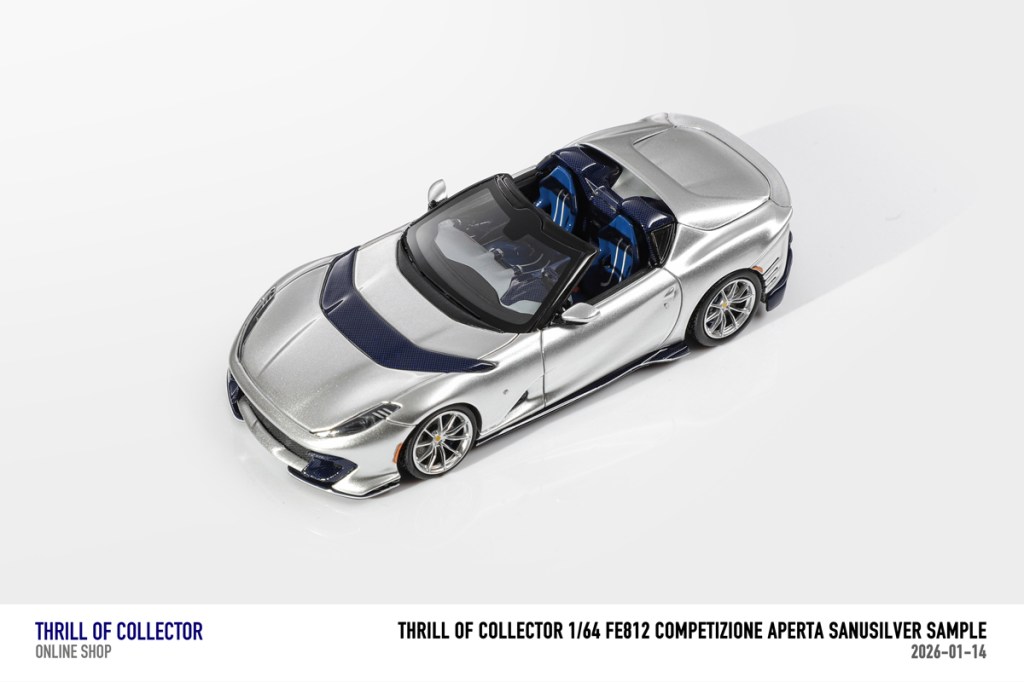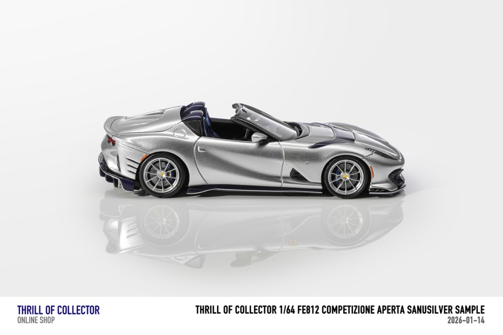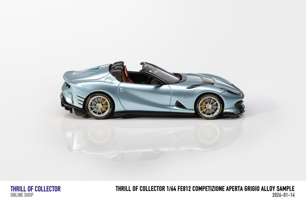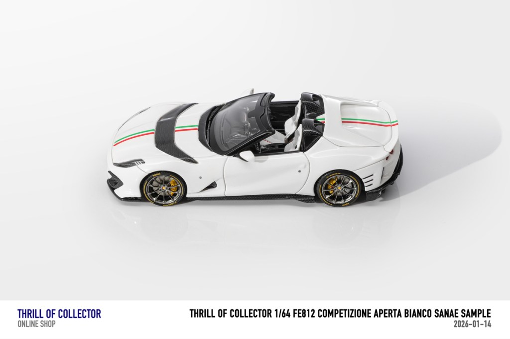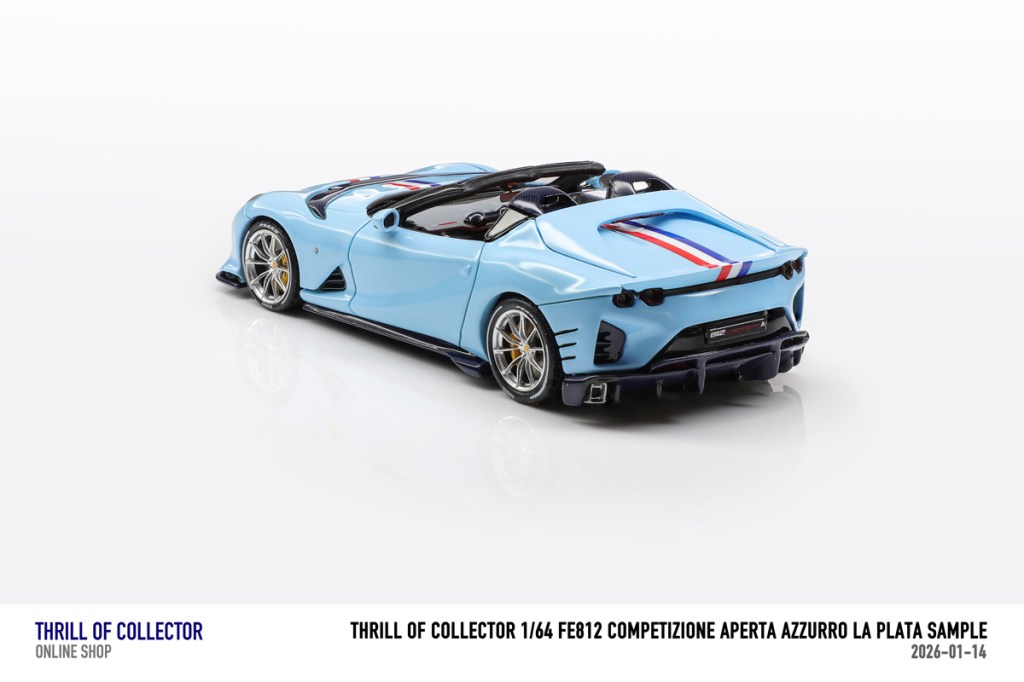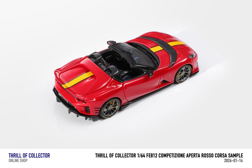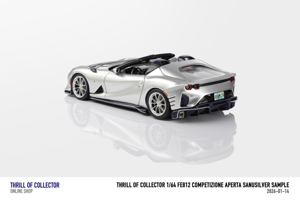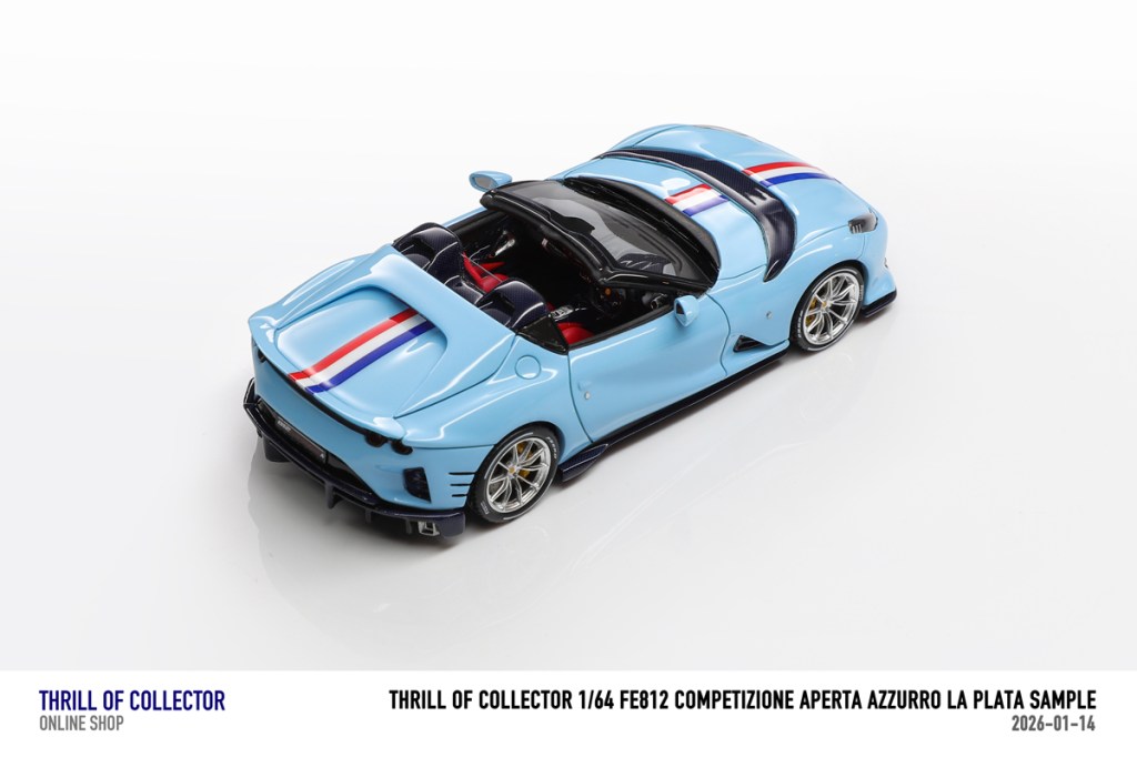 Thrill of Collector è un marchio cinese di resincast in scala 1:64 che fa capo alla nota Fuelme. E’ stata annunciata una serie di Ferrari 812 Competizione Aperta in vari colori e configurazioni, ognuna delle quali in edizione limitata a 199 pezzi. Il prezzo al pubblico consigliato è di USD 66.00, con un margine assai limitato rispetto al prezzo ai dettaglianti, che è di 50 dollari. Misteri della Cina. In ogni caso, questa è la lista completa delle versioni, che include tre “Shenzhen special editions”, vendute in un unico set a 175 USD.