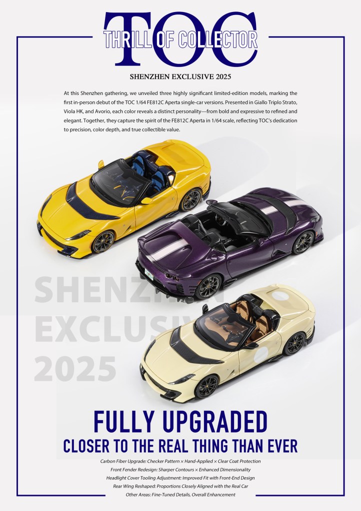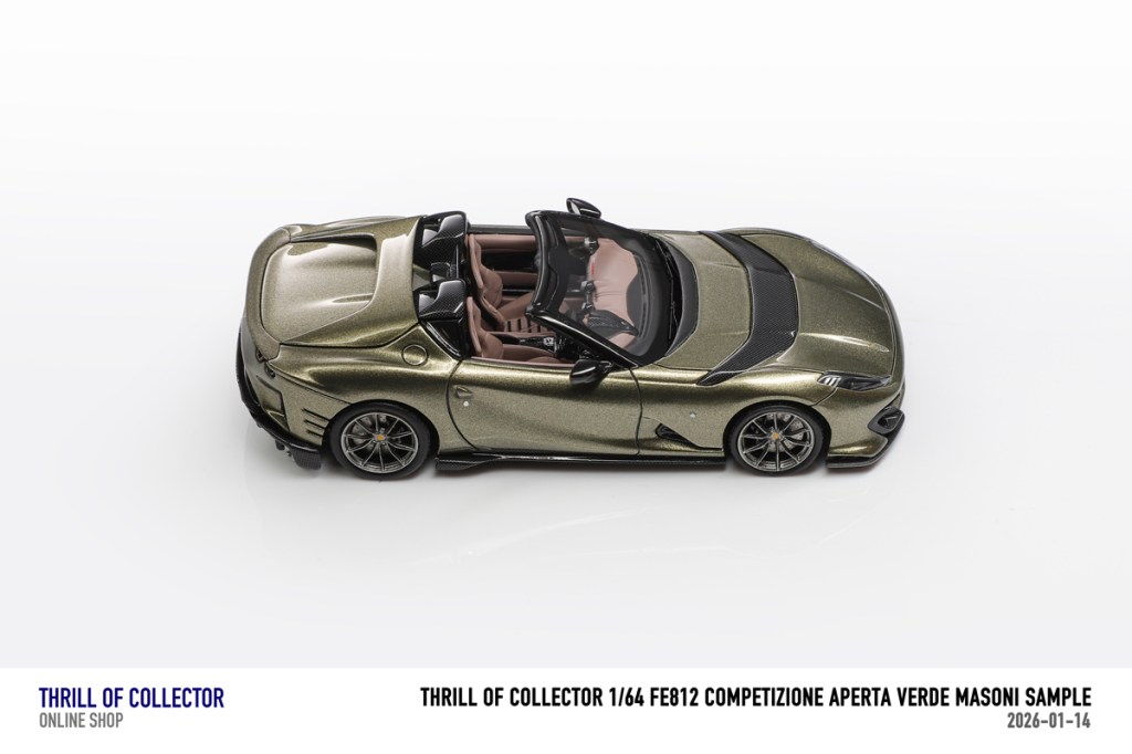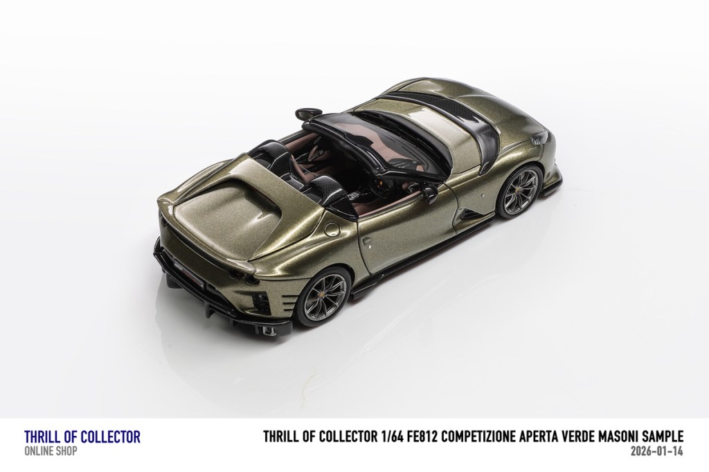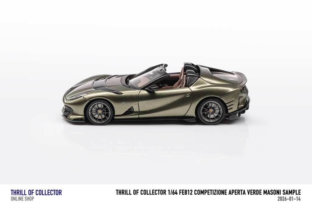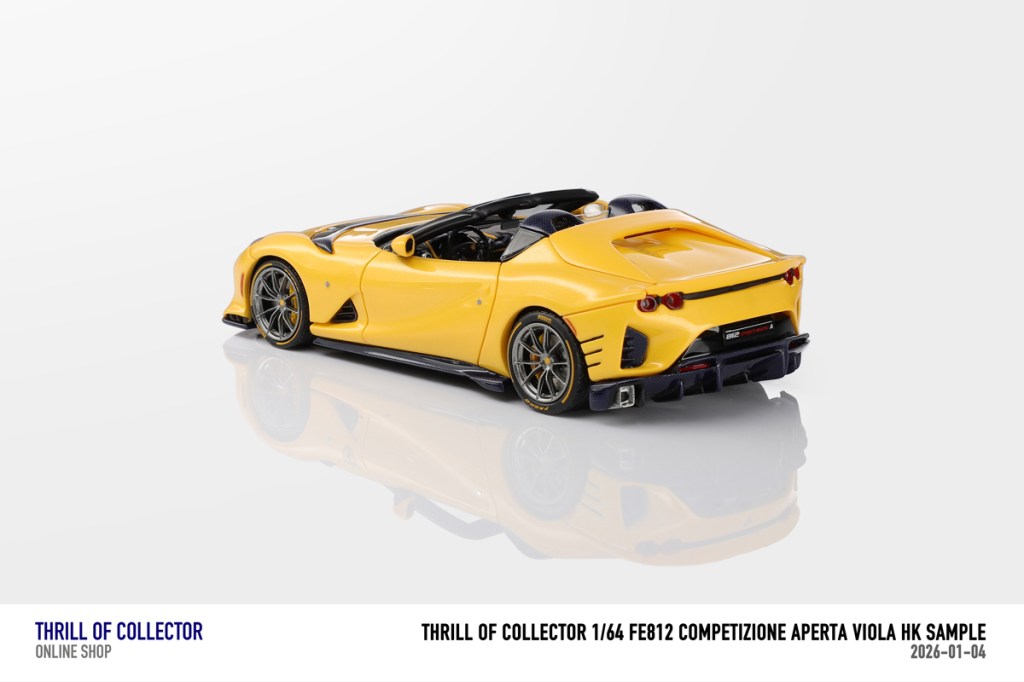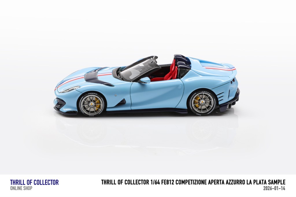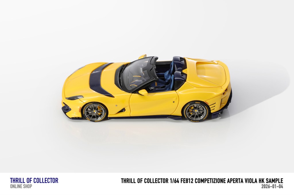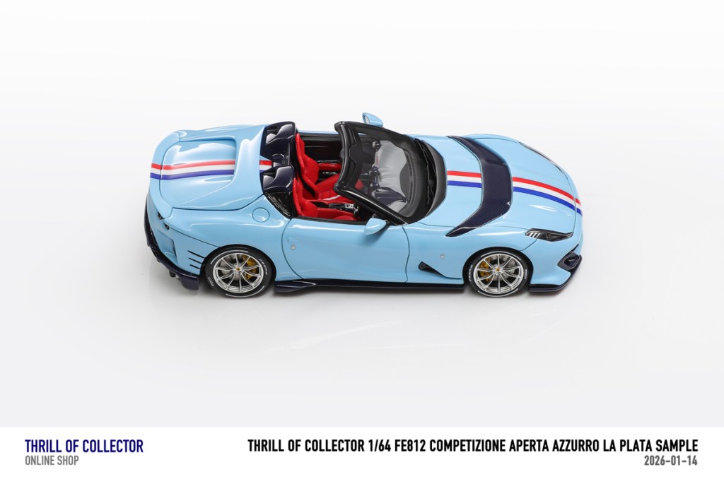 Thrill of Collector è un marchio cinese di resincast in scala 1:64 che fa capo alla nota Fuelme. E’ stata annunciata una serie di Ferrari 812 Competizione Aperta in vari colori e configurazioni, ognuna delle quali in edizione limitata a 199 pezzi. Il prezzo al pubblico consigliato è di USD 66.00, con un margine assai limitato rispetto al prezzo ai dettaglianti, che è di 50 dollari. Misteri della Cina. In ogni caso, questa è la lista completa delle versioni, che include tre “Shenzhen special editions”, vendute in un unico set a 175 USD.