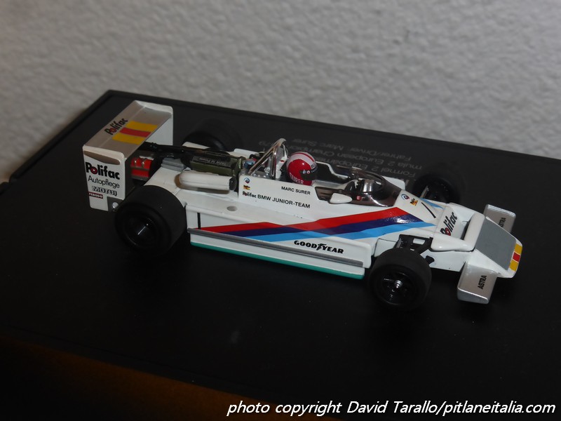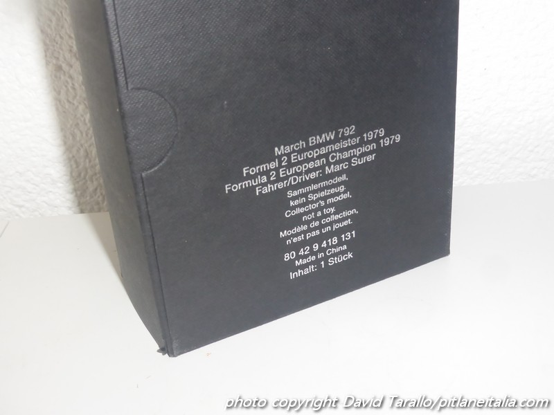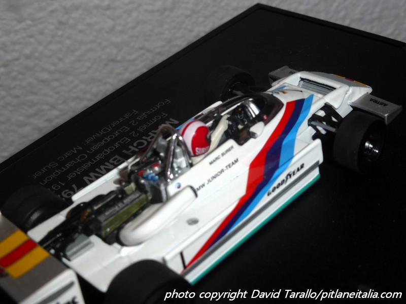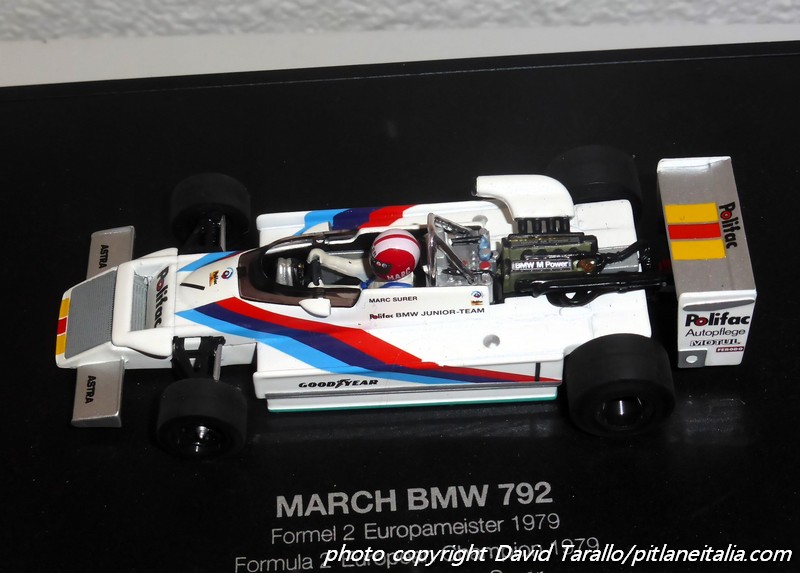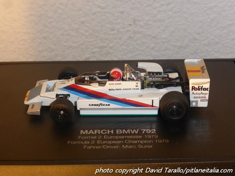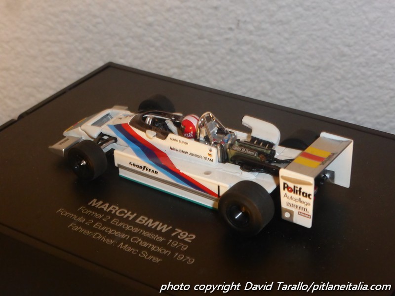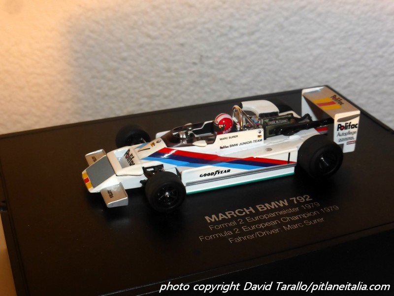 Minichamps già lavora con le case e una delle collaborazioni più proficue avviene con BMW. Nasce una serie promozionale contraddistinta da scatole in plastica nere con chiusura a clip, sobrie ed eleganti. In questa serie, nel 2001, appare un modello inusuale: è la March 792 F.2 portata al successo nel Campionato Europeo del 1979 da Marc Surer1. Il modello passò presto su eBay, soprattutto attraverso venditori tedeschi che andavano per la maggiore, come MRS Modellautos di Michael Rinke. Essendo un promozionale non costava neanche tanto e fu parecchio apprezzato dagli specialisti. Appunto, dagli specialisti. La Formula 2, specialmente quella del periodo di fine anni ’70-inizi anni ’80 non è mai stata molto popolare nell’ambito dell’1:43 e di questo modello non si parlò poi tantissimo.