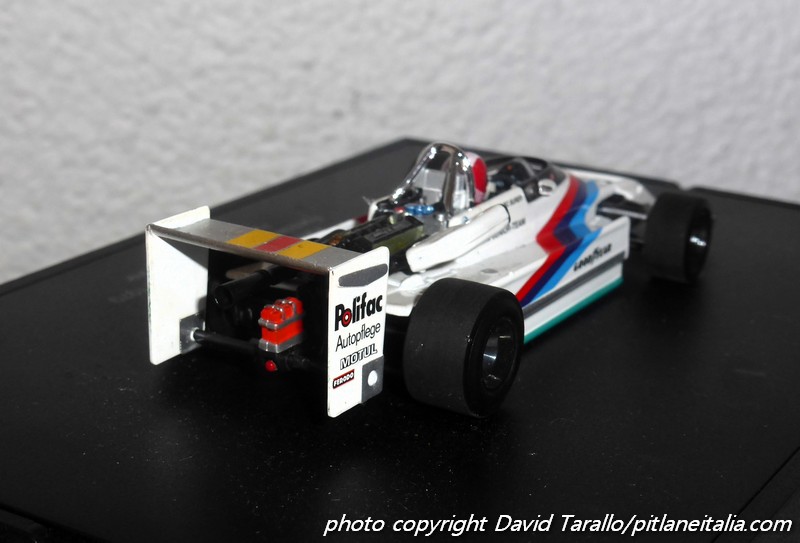 Eppure questo, secondo me, è uno dei migliori Minichamps di sempre. La riproduzione è di una finezza straordinaria, con particolari in plastica stampati con eccezionale pulizia e fedeltà. Il motore BMW 2000 è riprodotto in modo semplice ma assolutamente soddisfacente. Come in tutte le monoposto Minichamps, è presente il figurino del pilota, che tutto sommato regge ancora il confronto con gli odierni omologhi di Spark. Sicuramente, all’epoca dava diversi punti ai vari Quartzo, Skid e compagnia. Di notevole qualità anche la riproduzione di cerchi, gomme (che hanno quella giusta opacità tipica degli pneumatici “rodati”), spoiler posteriore, attacchi delle sospensioni e così via. Realistico anche l’assetto. Oltretutto i cerchi sono del tutto esenti da rischi di reazioni con vernici, essendo in plastica nera grezza.