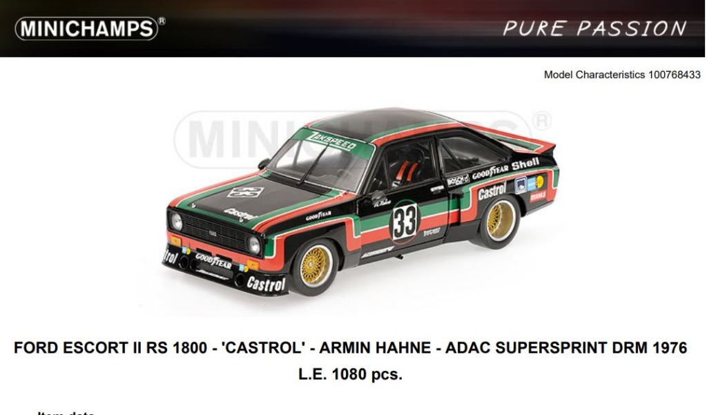 Per amore di completezza – e visto che i padri sono per larga parte gli stessi – accenniamo alle due Escort II Gruppo 2 diecast uscite col marchio Minichamps a fine 2015: l’Europa Möbel DRM Nürburgring 1976 (art. 100768432) e la Castrol ADAC Supersprint DRM 1976 (art. 100768433).