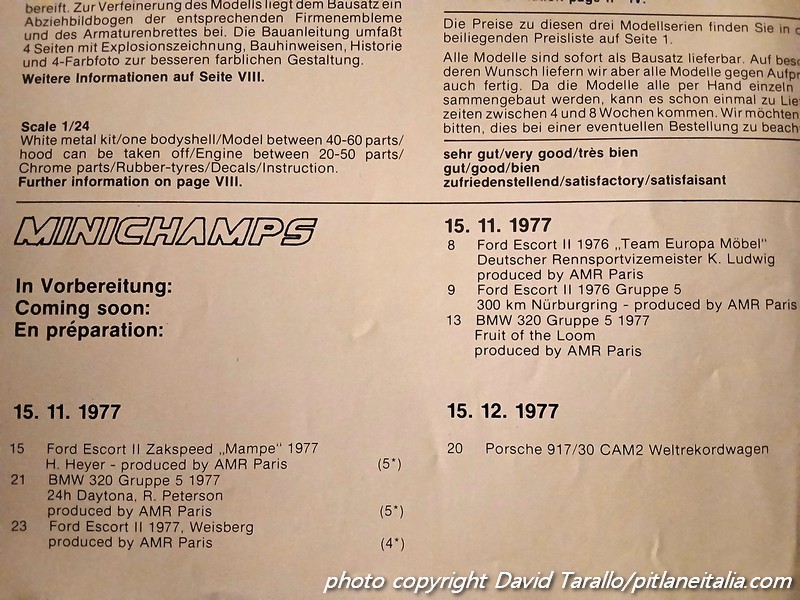La serie Minichamps si arricchì a ruota con le prime BMW 320 Gruppo 5 (kit tradizionale in metallo bianco), dopodiché apparvero altre versioni della Escort: la Zakspeed-Mampe Gr.5 1977 (numero di catalogo 15), la Grab-Weisberg Gr.5 1977 (n.23) e la Zakspeed-Mampe Gr.5 1978 (n.30).