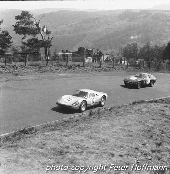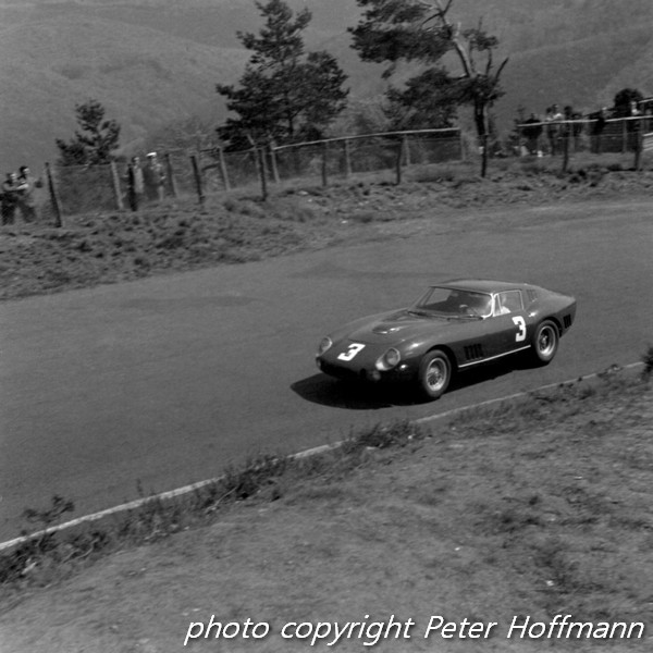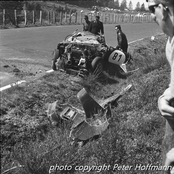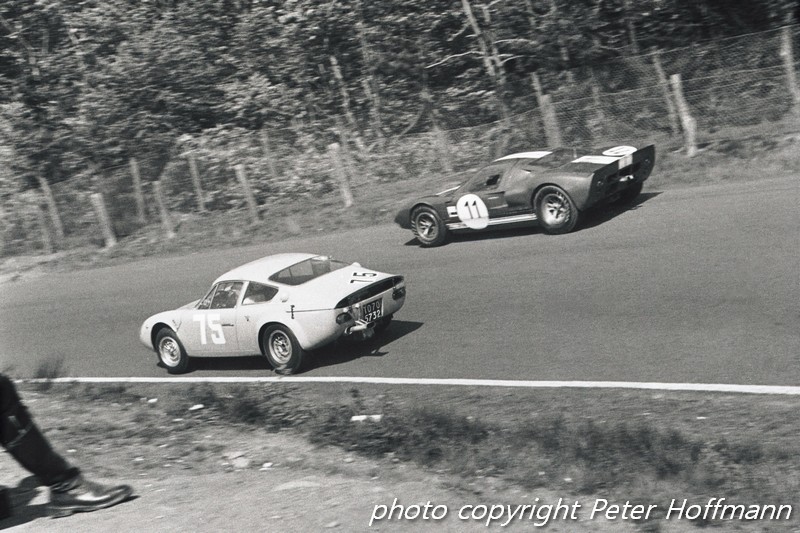 In meno di mezz’ora la situazione cambiò: il sole aveva dissipato la nebbia e si udivano i primi motori che si riscaldavano nel paddock a circa tre chilometri di distanza. Poco dopo, il rombo che aumentava e diminuiva indicava che le prime vetture avevano iniziato le prove. Poco dopo apparve la prima auto, una Lotus Elan. A poco a poco ne seguirono sempre di più, dalle piccole GT alle sport-prototipo come le Ford GT40. Nella classe dei prototipi era presente anche una Ferrari 275 GTB con motore da 4 litri. Personalmente, però, ciò che mi affascinò di più fu la Cobra Roadster, utilizzata dall‘Alan Mann Racing esclusivamente per i test di pneumatici, con la quale Bob Bondurant si produsse in una spettacolare derapata proprio allo Schwalbenschwanz. Spettacolare fu anche l’uscita di un’Alfa Romeo TZ utilizzata dall’Autodelta, che Jean Rolland trasformò in un cumulo di rottami dopo aver toccato il bordo della pista.