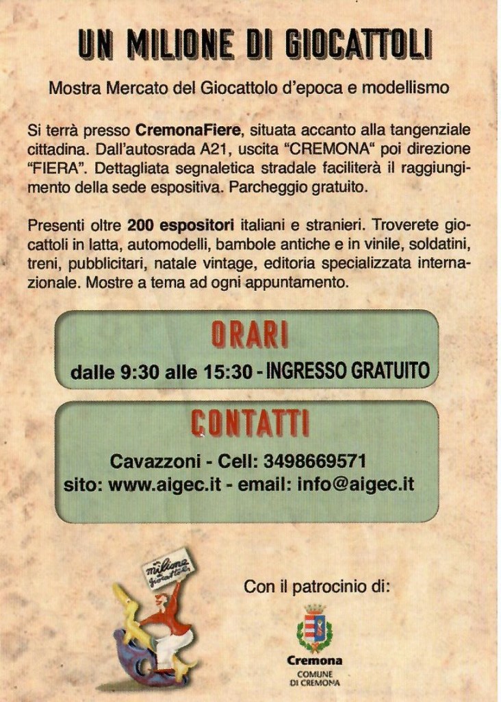 Torna anche nel 2026 la Mostra mercato del giocattolo d’epoca, organizzata dall’Associazione Italiana del giocattolo d’epoca e da collezione (AIGEC).