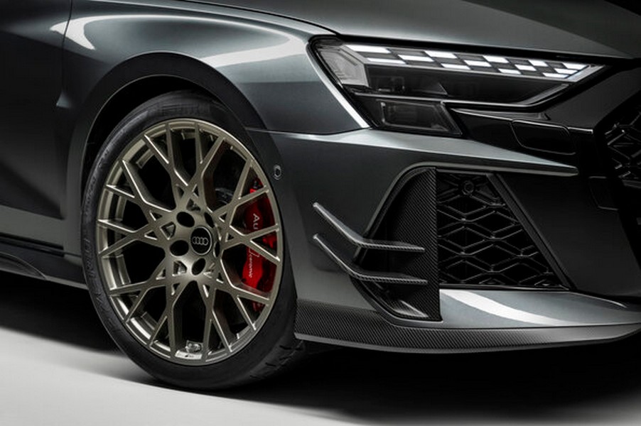 Gli elementi aerodinamici anteriori e lo spoiler sul tetto della RS 3 Sportback competition limited contribuiscono a ridurre la portanza su entrambi gli assi. Sulla versione berlina, il nuovo splitter anteriore e i canard migliorano il bilanciamento tra asse anteriore e posteriore.