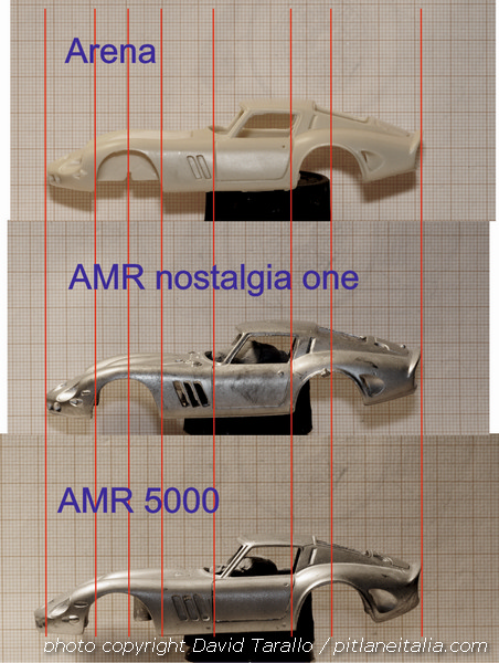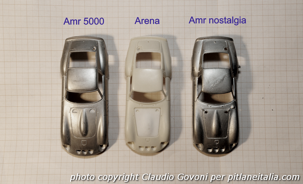 Passiamo ora al confronto. Già da in mano, mi è stato subito evidente che David aveva ragione. La parentela balza all’occhio, nondimeno ho estratto dalla fida carpetta della cancelleria un foglio di carta millimetrata e ho cominciato a confrontare il prodotto veronese con i suoi omologhi francesi. Se è vero che, come diceva il mio professore di metodi statistici multivariati, “nel numero c’è la verità”, dobbiamo ammettere che la parentela tra il modello italiano e il Nostalgia One è strettissima. Stesse misure in lunghezza, larghezza e altezza, stesso sviluppo delle forme. Sì, qualche intervento è stato fatto: ovviamente la modifica per rendere il cofano intercambiabile, poi la rimozione dei particolari stampati direttamente sulla scocca in modo da poter usare quelli riportati e, forse, anche un leggero intervento sui passaruota anteriori, ma per il resto i due modelli sono totalmente sovrapponibili. Senza pesarli, una volta verniciati, dubito che sarebbe facile distinguere le due scocche.