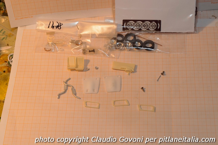 Non voglio qui spingermi in una disamina dettagliata del kit. Mi limito a una panoramica veloce: è un prodotto di qualità piuttosto alta, con moltissime fotoincisioni e parecchi particolari in stampa 3D o torniti. I vetri sono a filo e non termoformati (tranne alcuni particolari come le coperture dei fari e le prese d’aria del cofano anteriore). Le ruote hanno i raggi fotoincisi – personalmente preferisco quelle in filo dei cerchi Bosica, ma in questa scala quasi non si nota – e i gallettoni orientati correttamente.