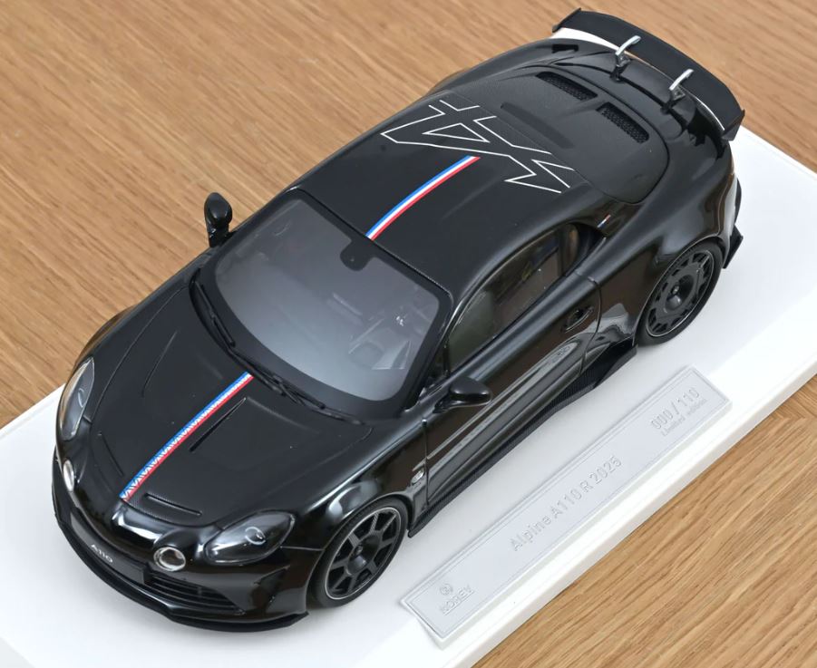 Il primo modello riproduce la versione A110 R nella configurazione “French Signature” 2025, proposta nella colorazione Noir Profond; referenza di catalogo 185436 e tiratura limitata di 110 esemplari numerati.