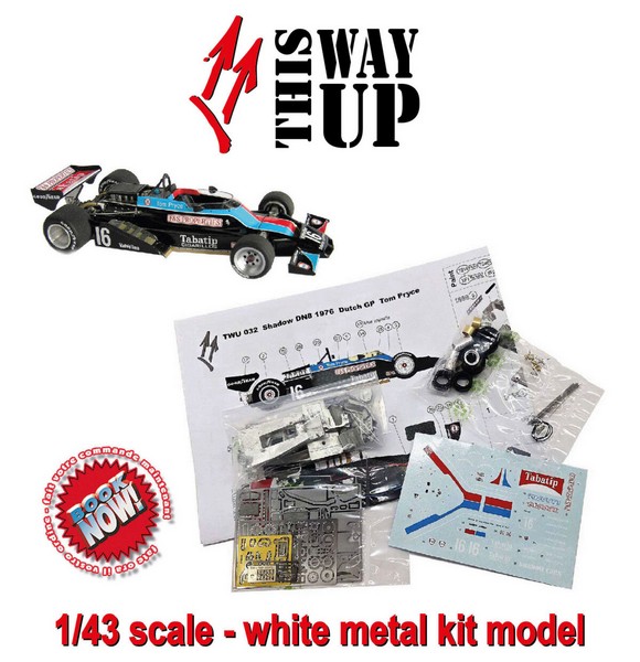 Tameo ripropone un vecchio kit 1:43 prodotto dall’azienda sudafricana This Way Up, la Shadow Ford DN8 che fece il suo debutto al Gran Premio d’Olanda 1976 con Tom Pryce. Si tratta di un kit (catalogo TWU032) con parti fuse in metallo bianco, largo utilizzo delle fotoincisioni, parti tornite e pneumatici in gomma. Tameo ha deciso di lasciare il modello esattamente come era stato prodotto all’epoca del lancio, non avendo troppo senso aggiornarlo agli standard attuali.