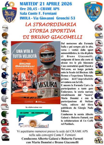 Martedì 21 aprile alle ore 20.45, presso la Sala Conte F. Ferniani del CRAME APS, in via Giovanni Gronchi 53 a Imola, si terrà la presentazione del libro “Continuavano a chiamarmi ‘Jack O’Malley’”, dedicato alla carriera di Bruno Giacomelli. L’iniziativa è organizzata in collaborazione con il Club Romagnolo Auto e Moto d’Epoca.